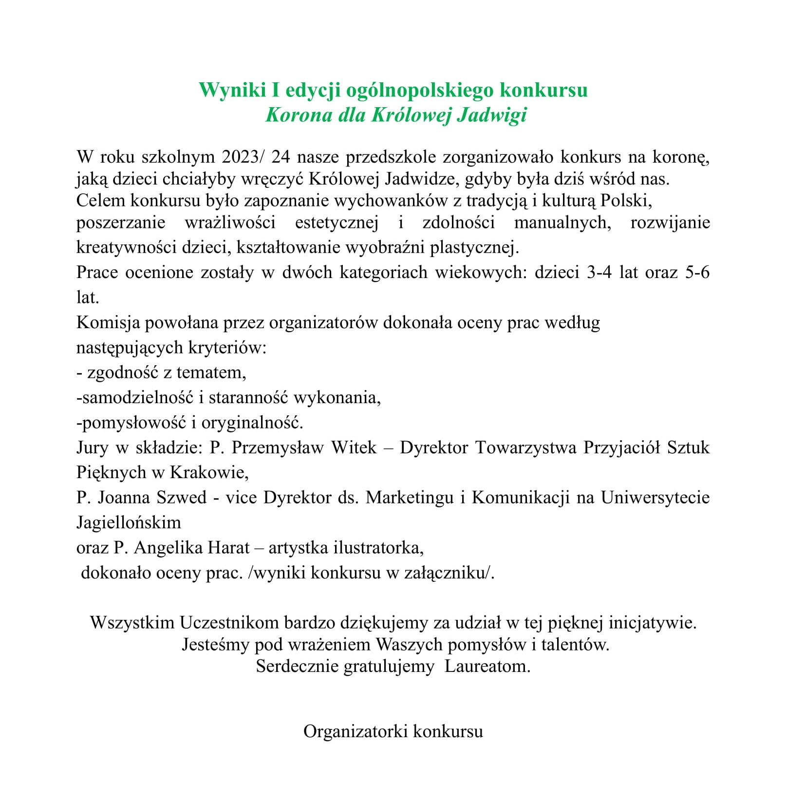 Wyniki I edycji ogólnopolskiego konkursu Korona dla Królowej Jadwigi