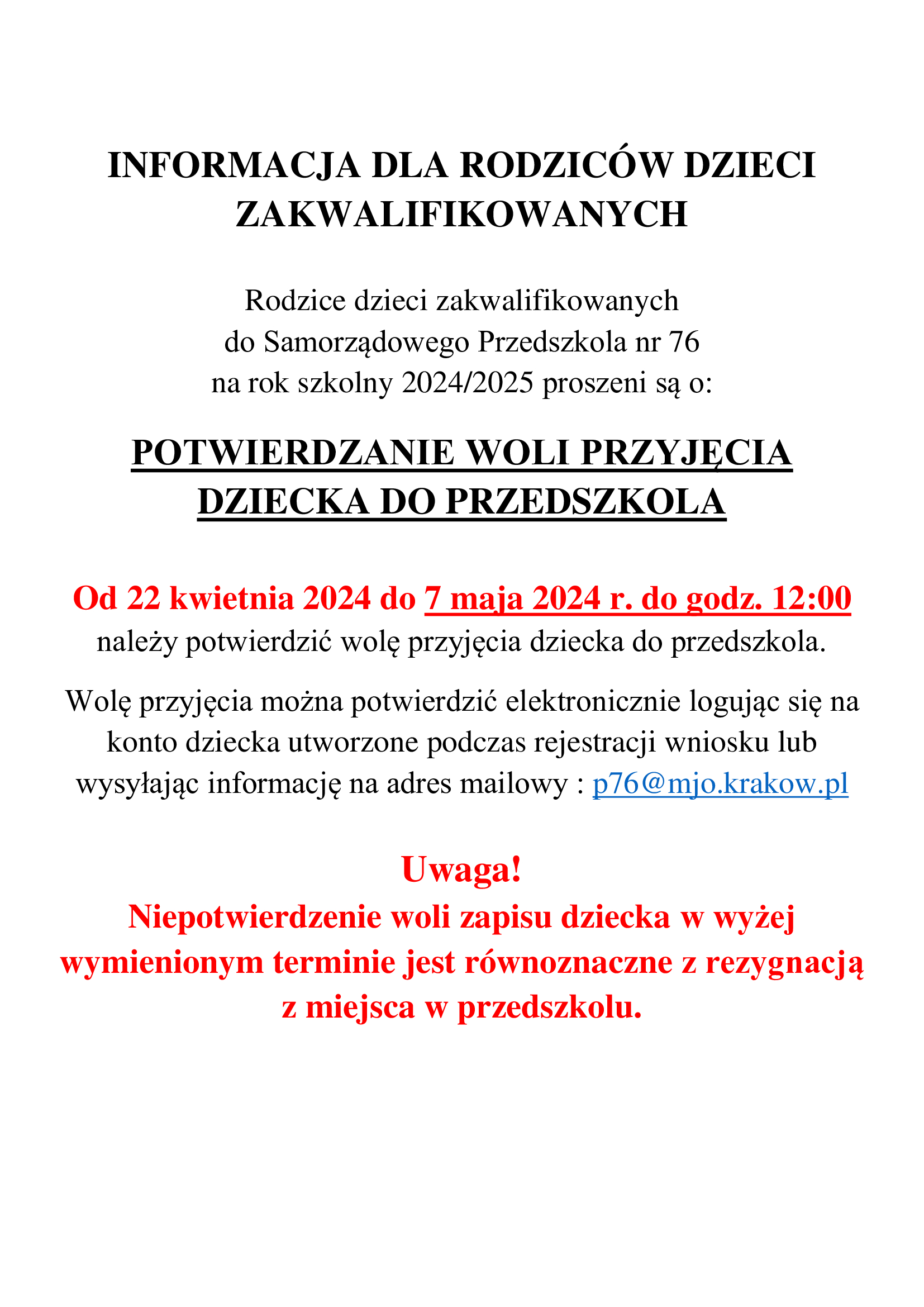 INFORMACJA DLA RODZICÓW DZIECI ZAKWALIFIKOWANYCH