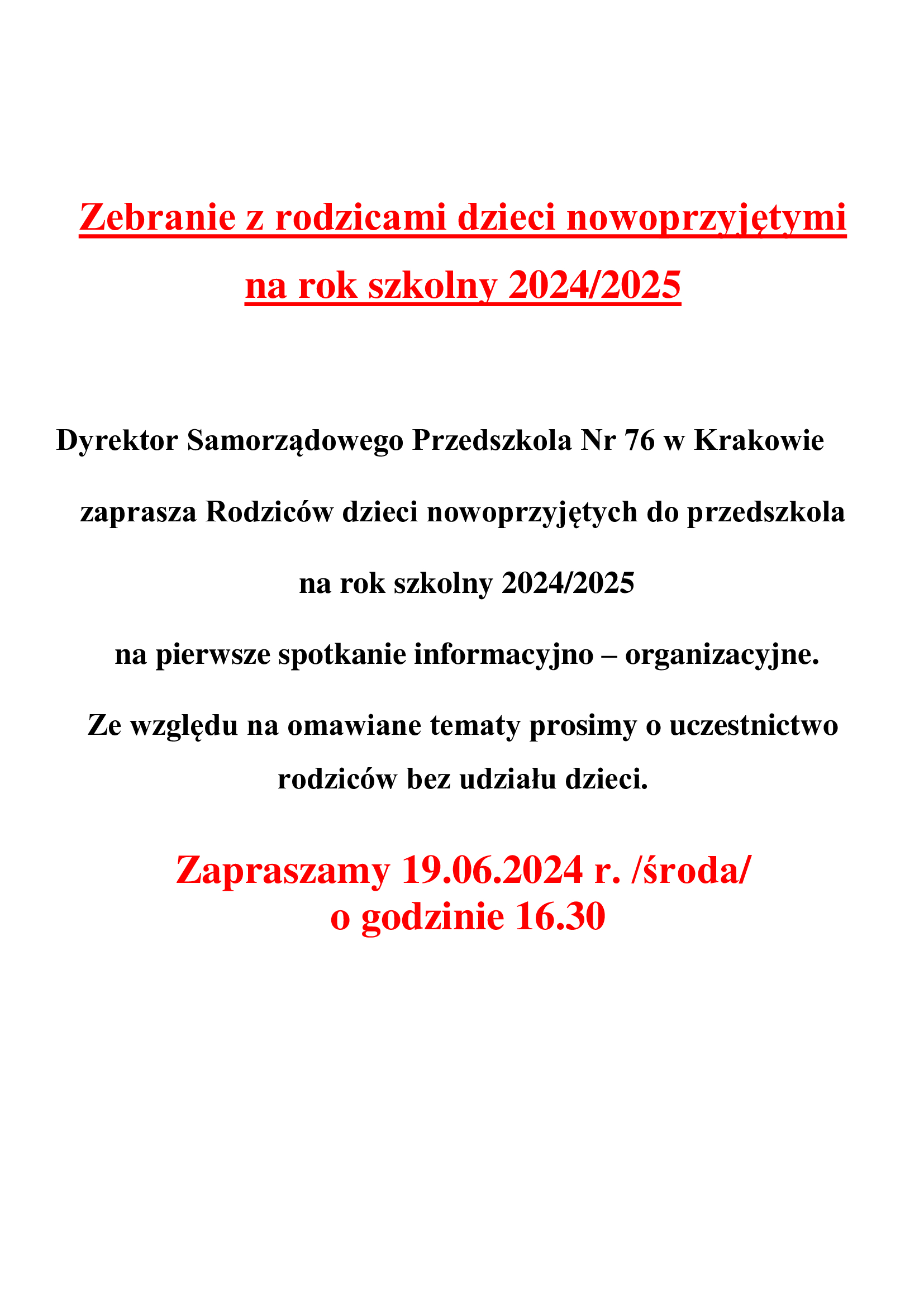 ZEBRANIE Z RODZICAMI DZIECI NOWOPRZYJĘTYMI NA ROK SZKOLNY 2024/2025