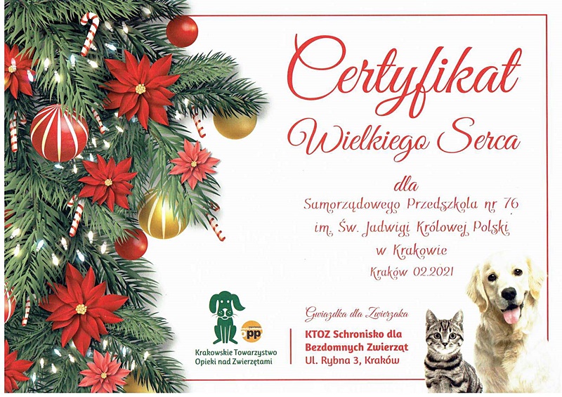 Bardzo dziękujemy wszystkim Dzieciom i Rodzicom, którzy wzięli udział w tegorocznej akcji charytatywnej „Gwiazdka dla Zwierzaka” Dzisiaj nasze przedszkole, za złożone dary otrzymało Certyfikat Wielkiego Serca od KTOZ Schroniska dla Bezdomnych Zwierząt w Krakowie.