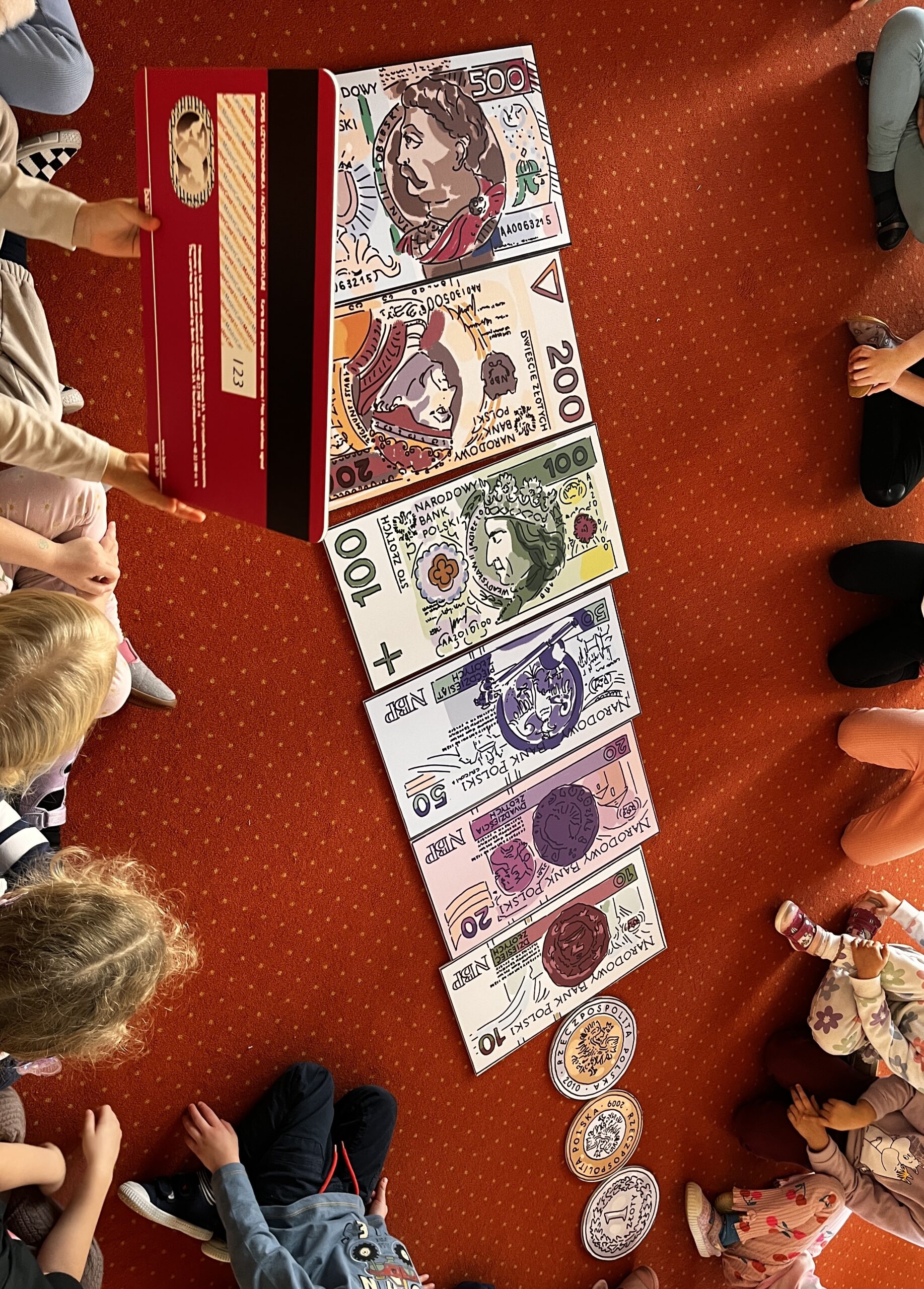W czasie spotkania przedszkolaki dowiedziały się skąd się wzięły pieniądze, obejrzały sylwety monet i banknotów, które następnie układały od