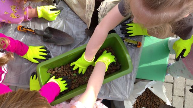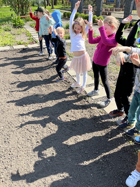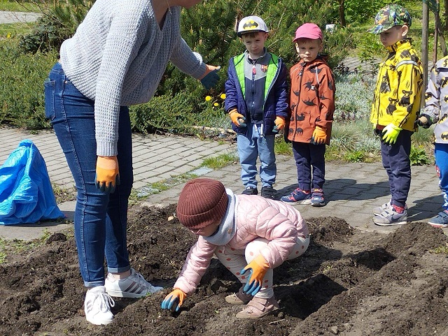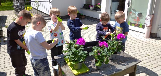 – sadzą podarowane przez Rodziców kwiaty na tarasie znajdującym się przy sali;