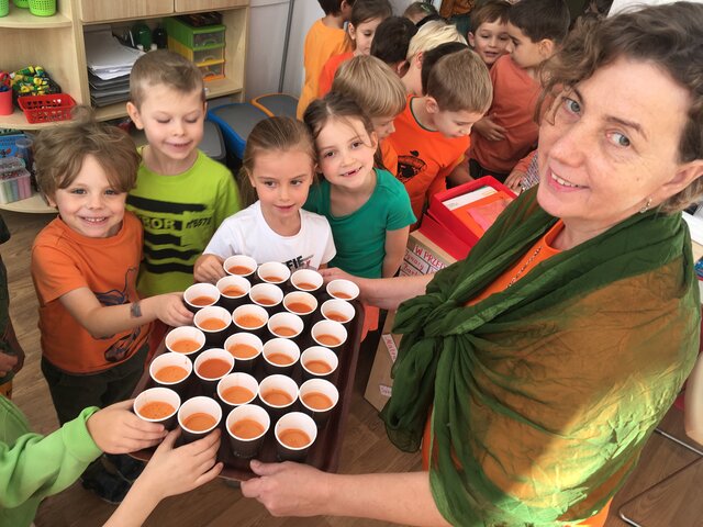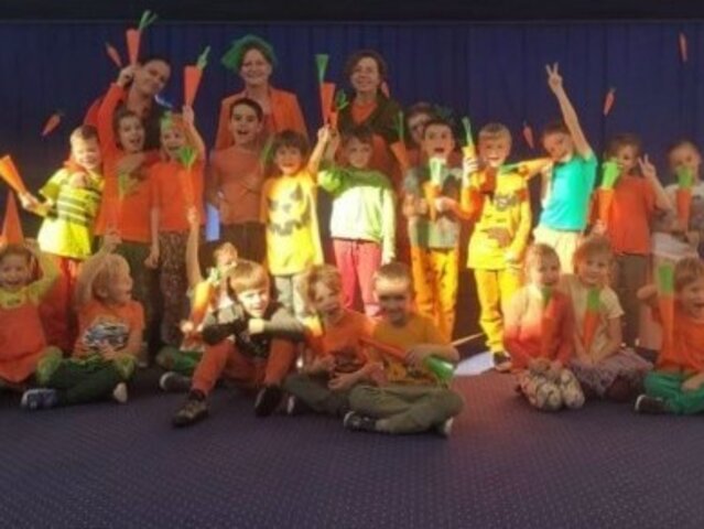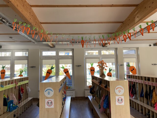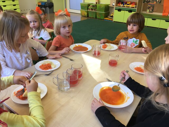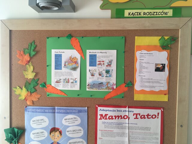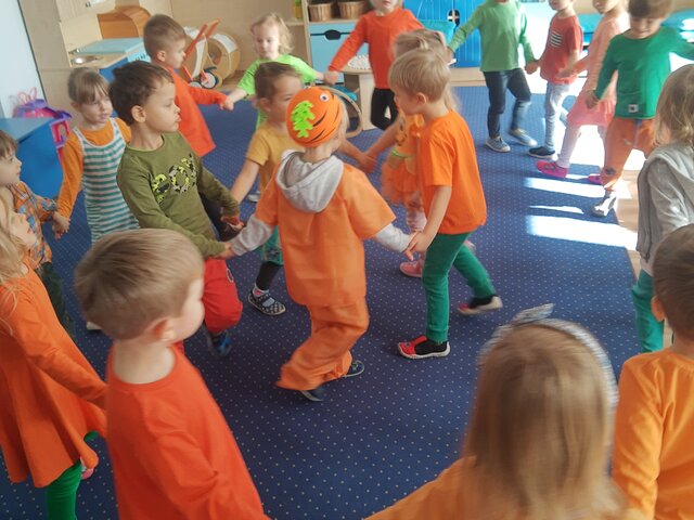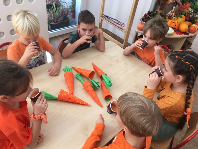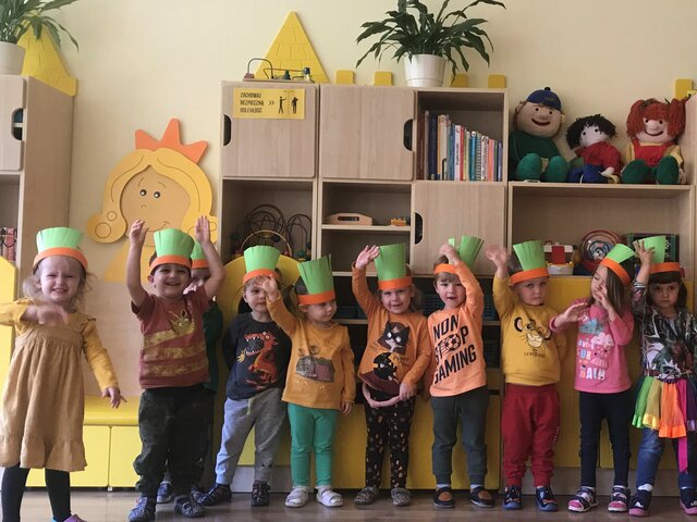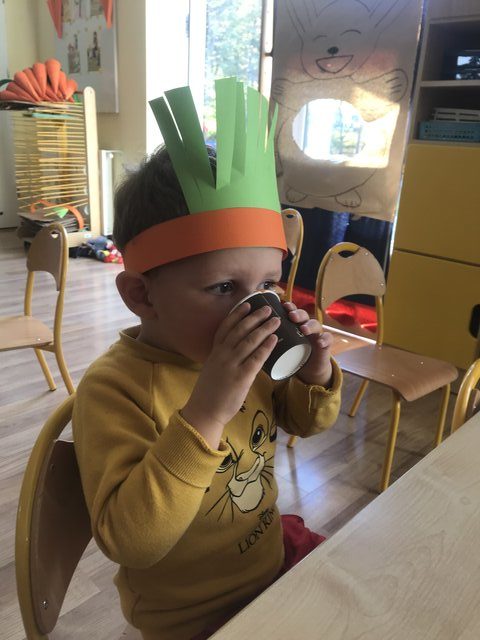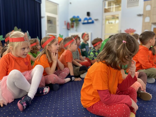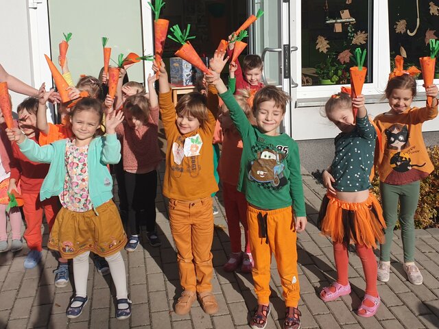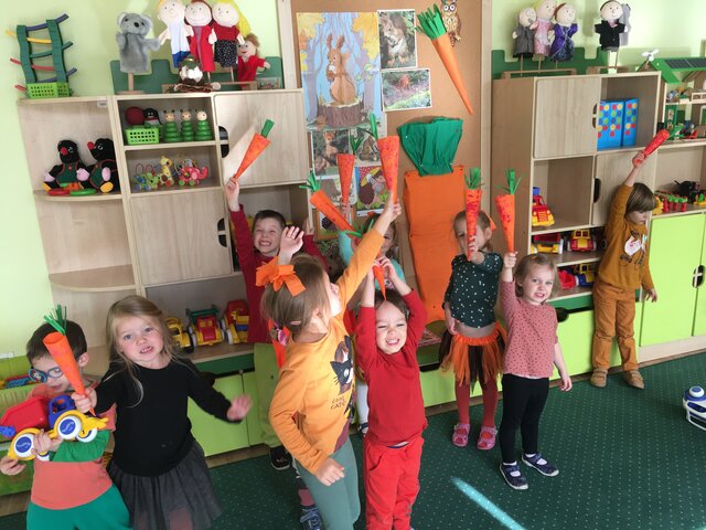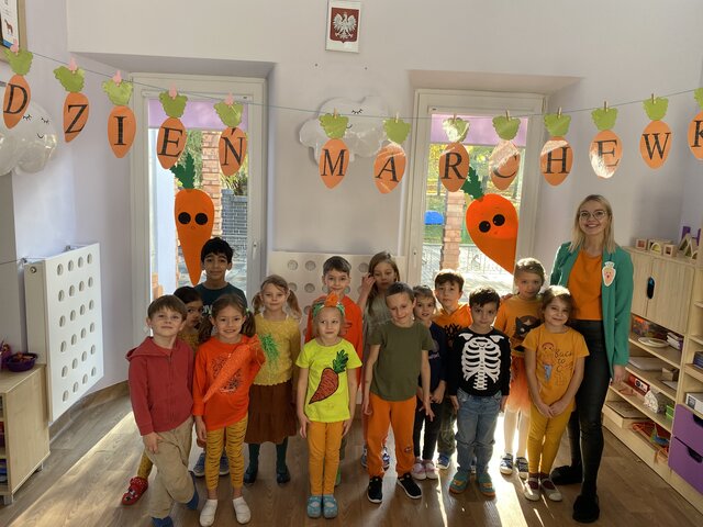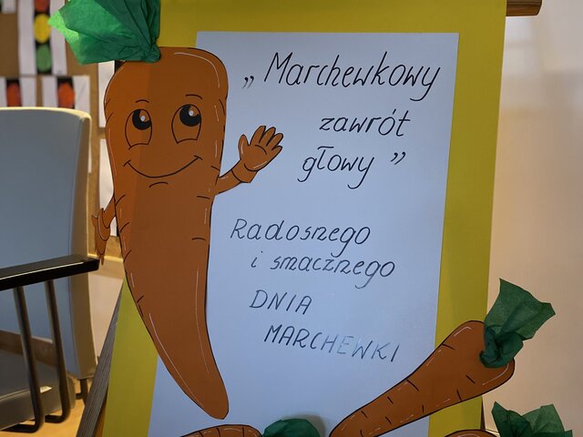Marchewkowy zawrót głowy – taki plakat powitał wszystkich wchodzących do przedszkola i był zapowiedzią zabaw i smakołyków związanych z tym warzywem. Całe przedszkole przystrojone było w marchewkowe ozdoby. A dzieci, poprzebierane w pomarańczowe stroje, chętnie chrupały marchewki podczas śniadania, uczestniczyły w przygotowaniu i degustacji soku, jadły marchewkowy obiad i ciasto. Zajęcia w tym dniu pełne były wesołych zabaw: były tańce, zawody sportowe, rzut marchewką, konkurs na marchewkowe budowle i ozdoby oraz zdjęcia w marchewkowej foto budce. A dla rodziców przygotowano na gazetce propozycje marchewkowego menu.