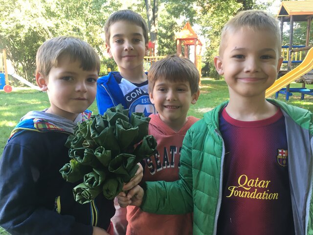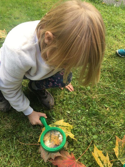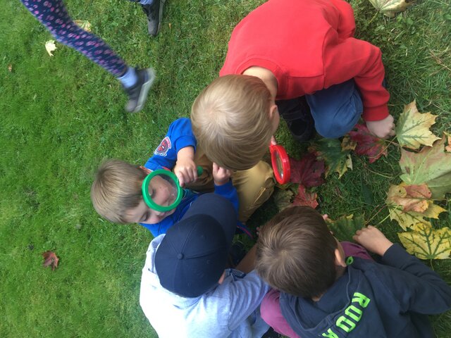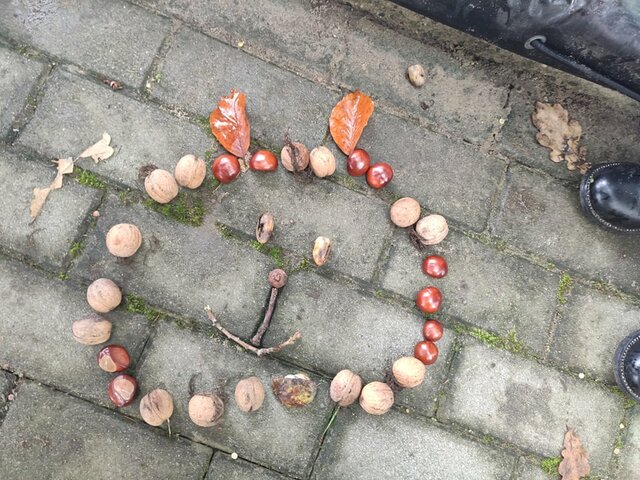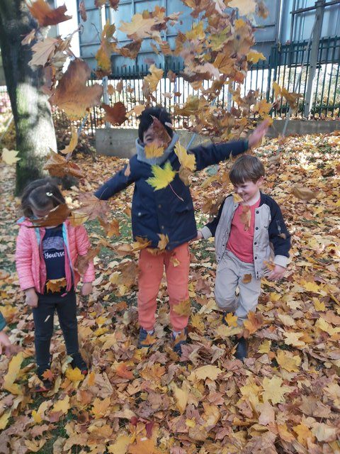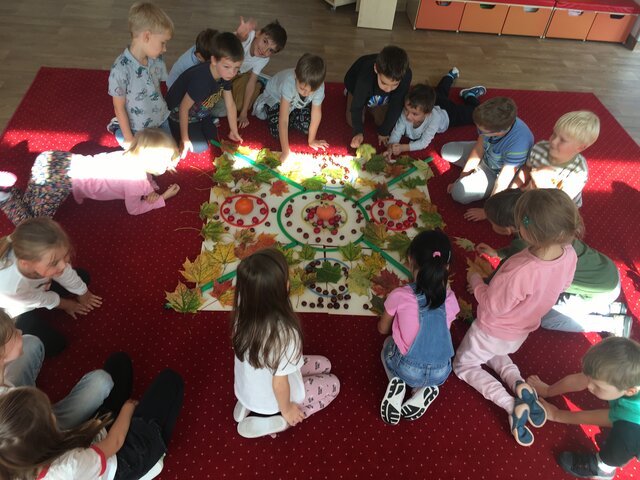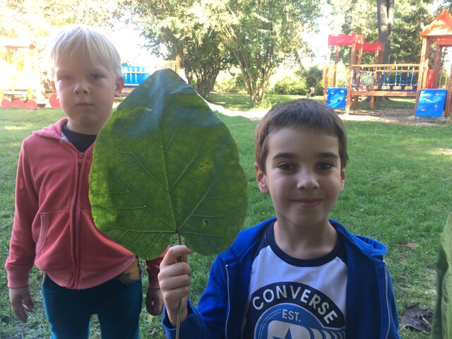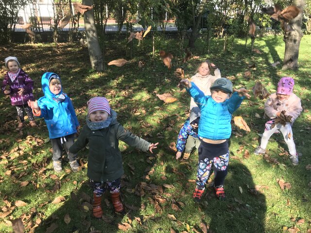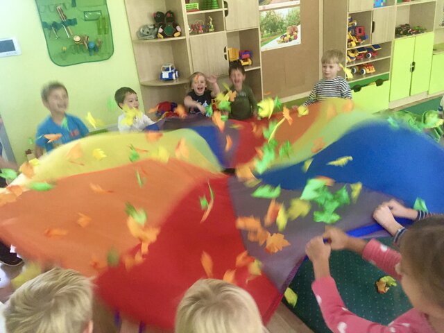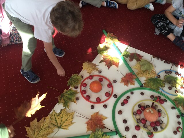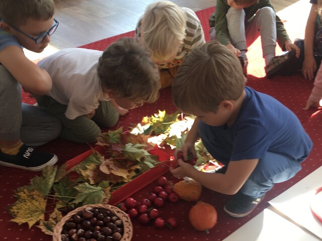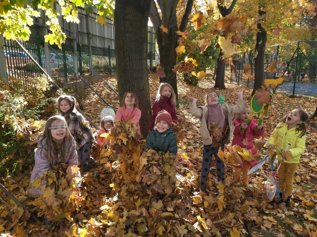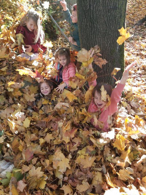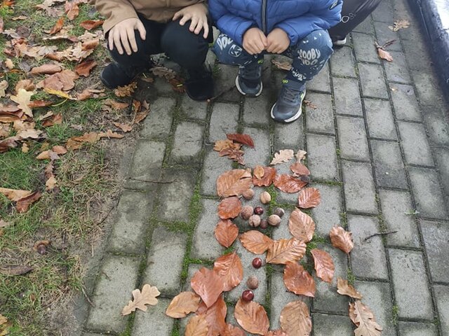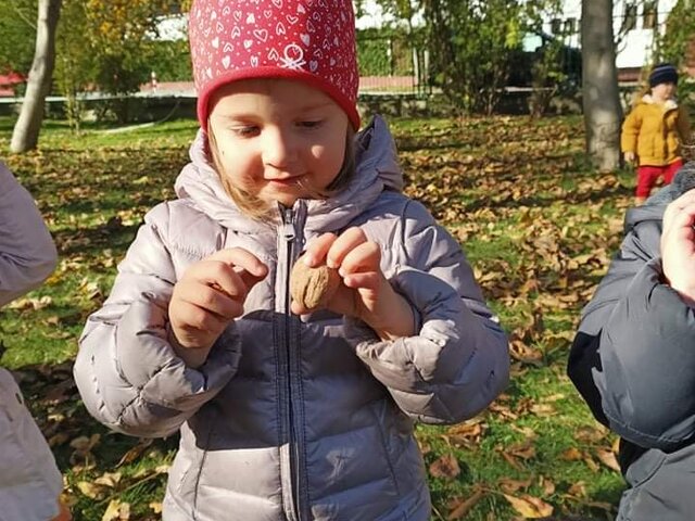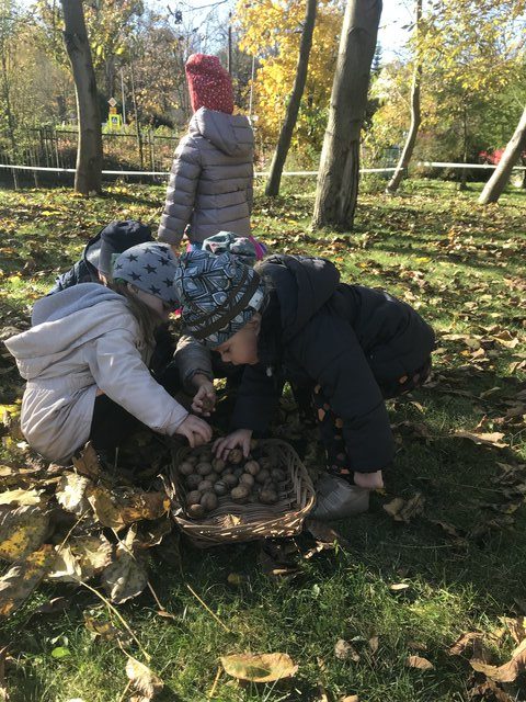 Jej barwy ukryte w liściach  ciągle nas zachwycają a owoce drzew radują nie tylko nasze oczy. Bardzo lubimy te jesienne harce w ogrodzie, smakowanie orzechów oraz zabawy  z liśćmi, kasztanami i żołędziami.