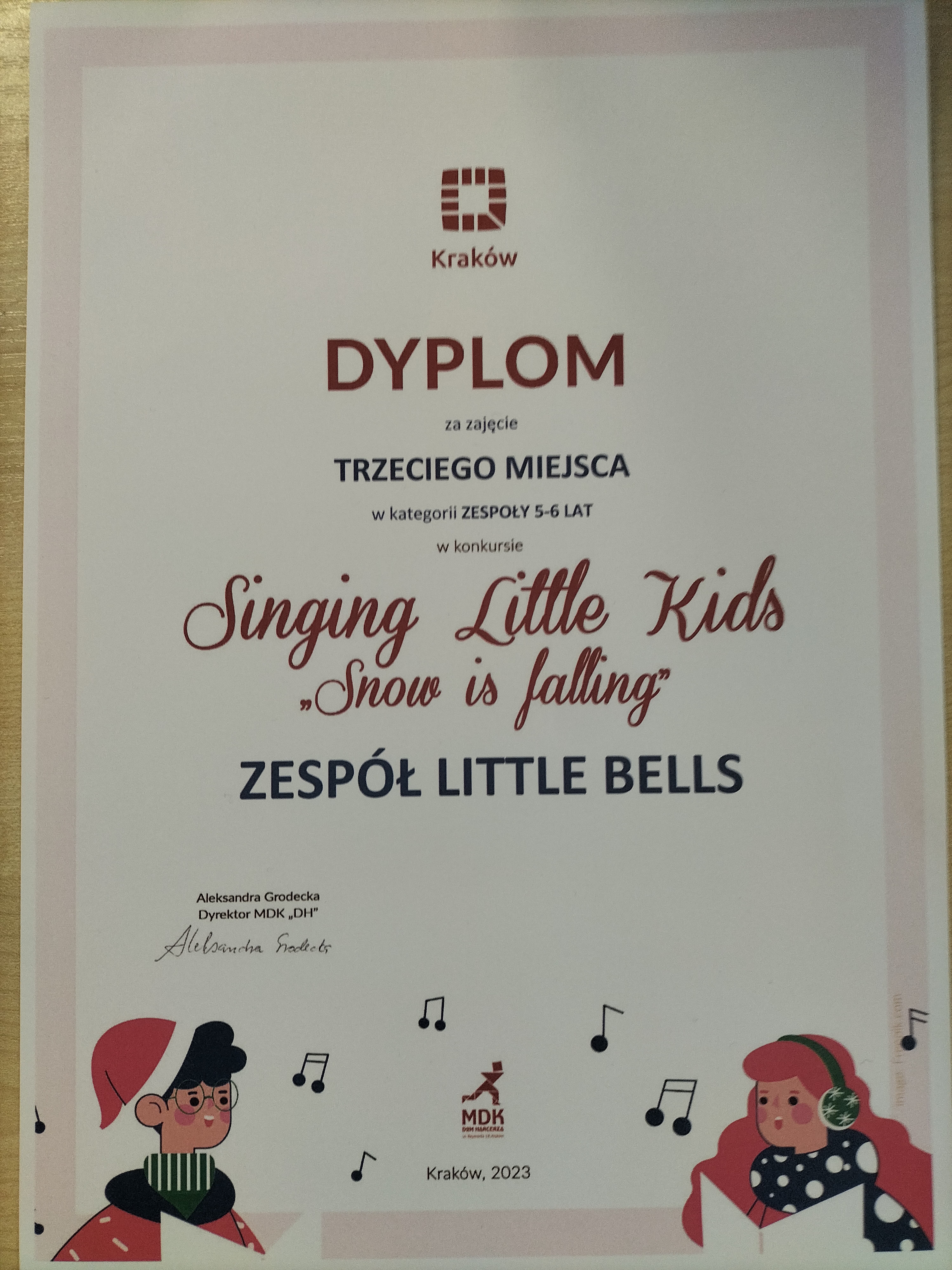 Z wielką radością informujemy, że przedstawicielki grupy „Podróżników” ( jako zespół „Little bells” ) w składzie: Laura Kania, Aleksandra Kotlinowska, Sylwia Majko zajęły III miejsce w kategorii zespoły 5-6 latki w konkursie wokalnym Singing Little Kids „Snow is Falling”, organizowanym przez MDK przy ulicy Reymonta w Krakowie. Gratulujemy i życzymy dalszych sukcesów!