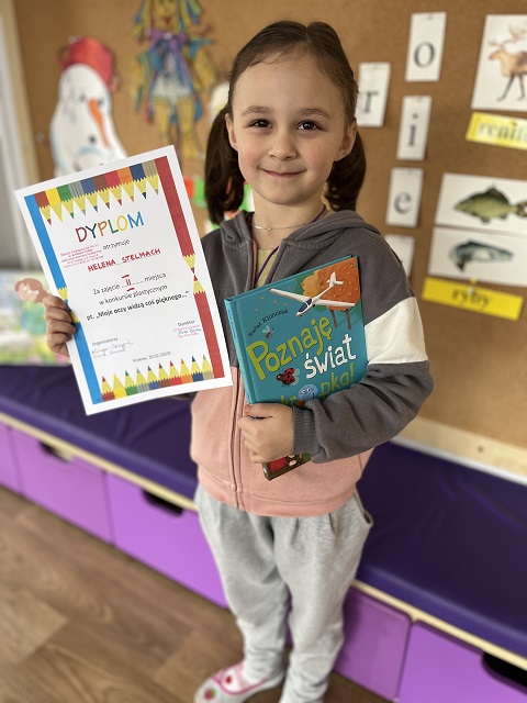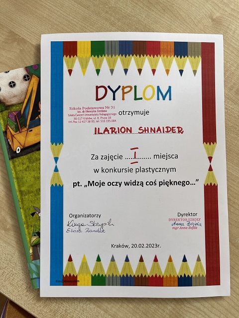 Miło nam poinformować o sukcesach plastycznych w grupie Myślicieli. Na wysokich miejscach w konkursie, organizowanym przez Szkołę Podstawową nr 31, pt.: Moje oczy widzą coś pięknego uplasowali się: Helenka Stelmach, Alicja Dyląg i Ala Lapida, Mateusz Krempa i Lena Grybel a I m zdobył Ilarion Shnaider. Natomiast w Centrum Jordana na konkursie pt.: Sztuka Ludowa Małopolski reprezentowali nas: Helenka, Szymon i Vera . I to właśnie Szymon Stawarz oraz Vera Kachuievska otrzymali nagrody. Natomiast Alicja Dyląg została wyłoniona z grupy Myślicieli by reprezentowała przedszkole portretem Królowej Jadwigi w międzynarodowym konkursie historyczno-plastycznym. Gratulujemy naszym przedszkolakom i życzymy dalszych sukcesów!