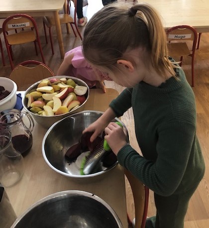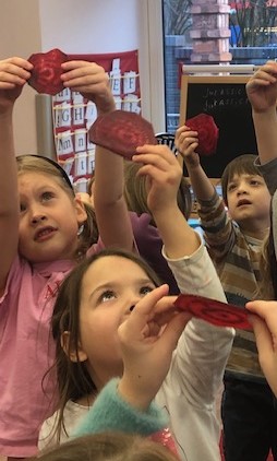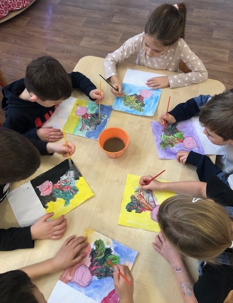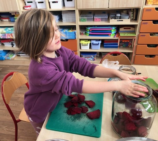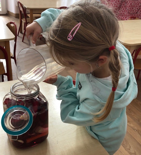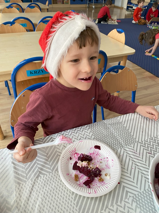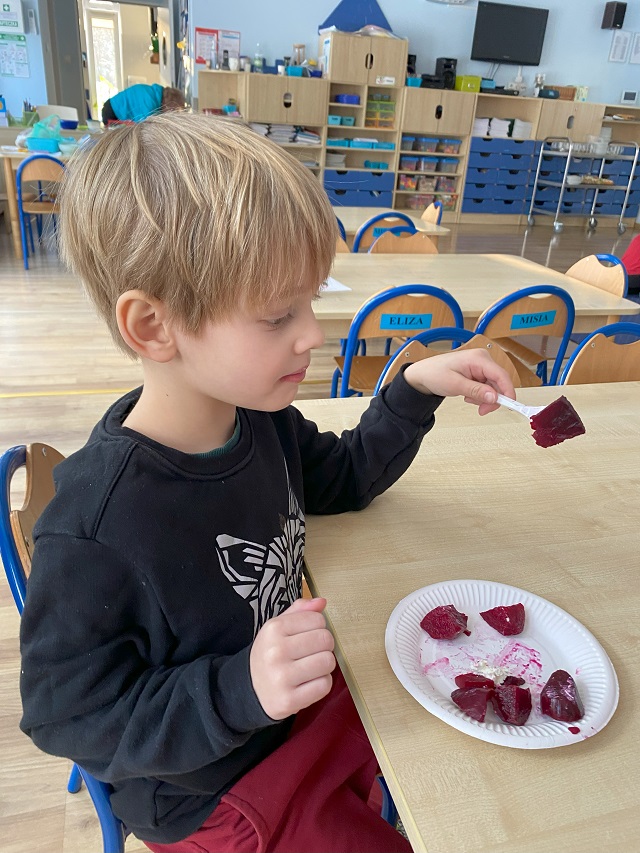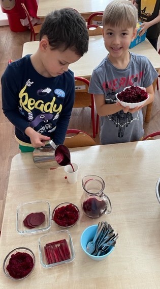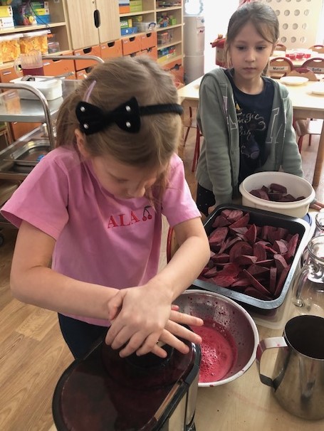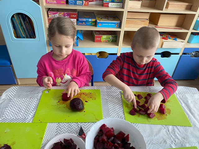 Tym razem w ramach projektu ,,Witaminki” dzieci miały okazję poznać buraka. Dzieci zaznajomiły się z właściwościami tego warzywa. Dowiedziały się, jak bardzo burak jest zdrowy. Nie obyło się również bez degustacji, którą przedszkolaki samodzielnie przygotowywały. Dzieci miały okazję zrobić zdrowy sok z buraka, zakwas czy sałatkę.