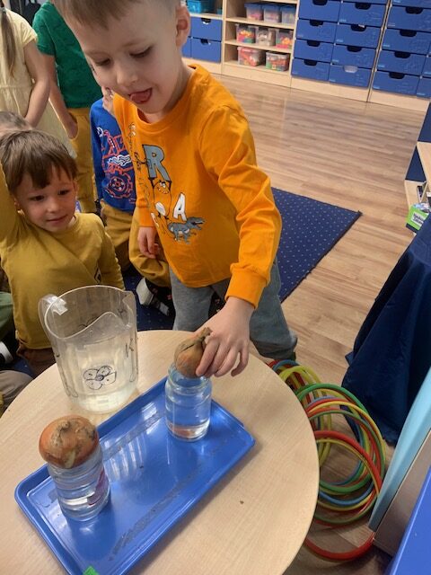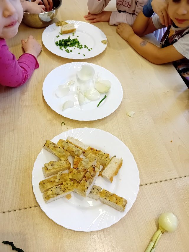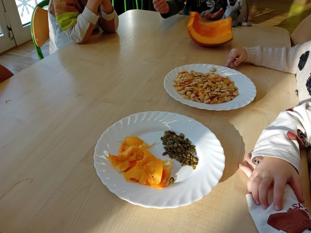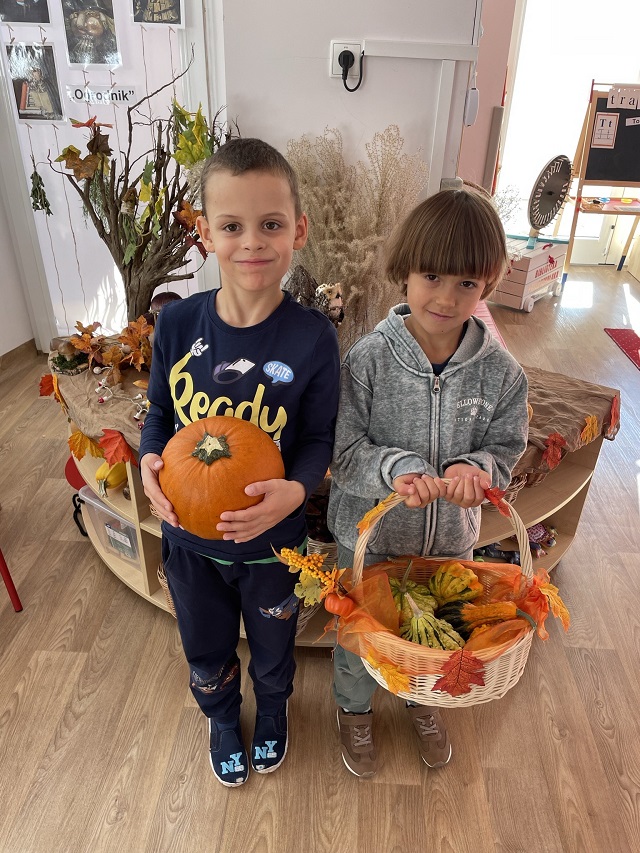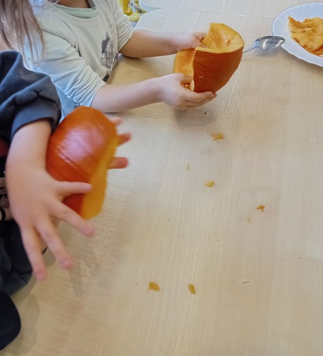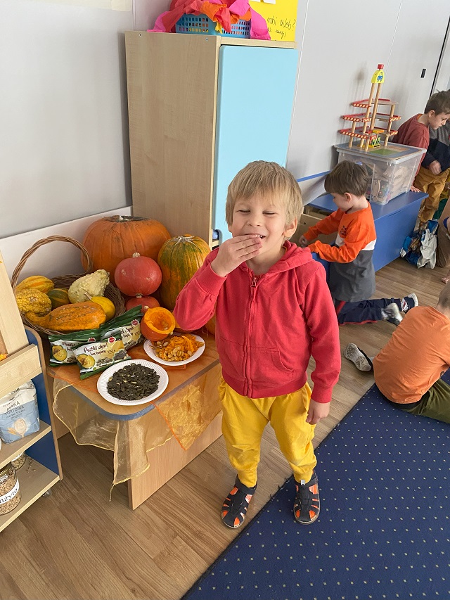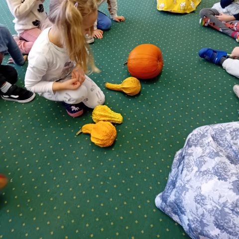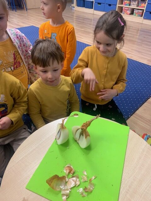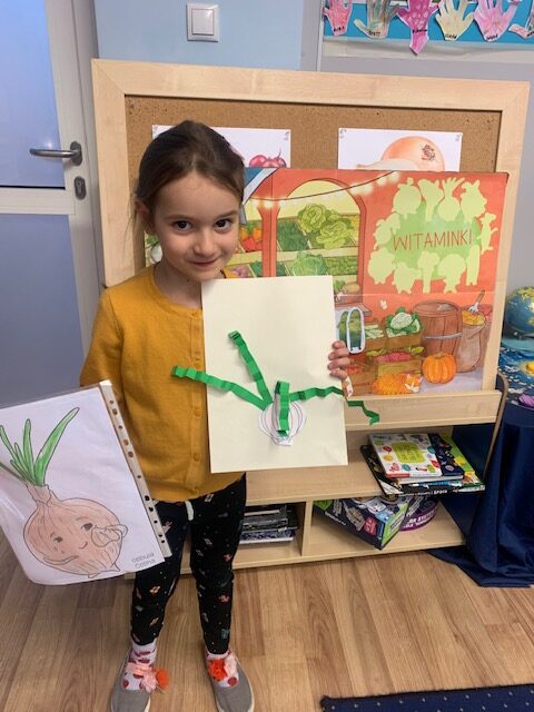 W ramach projektu edukacyjnego ,,Witaminki” dzieci w ostatnim czasie miały okazję poznać wielozmysłowo dynię oraz cebulę. Dzieci poznawały warzywa poprzez zabawy ruchowe a także zabawy badawcze. Miały okazję je smakować w różnych postaciach. Dzieci chętnie tworzyły prace plastyczne odzwierciedlające dane warzywo. Poznawanie warzyw to dla nich duża frajda!