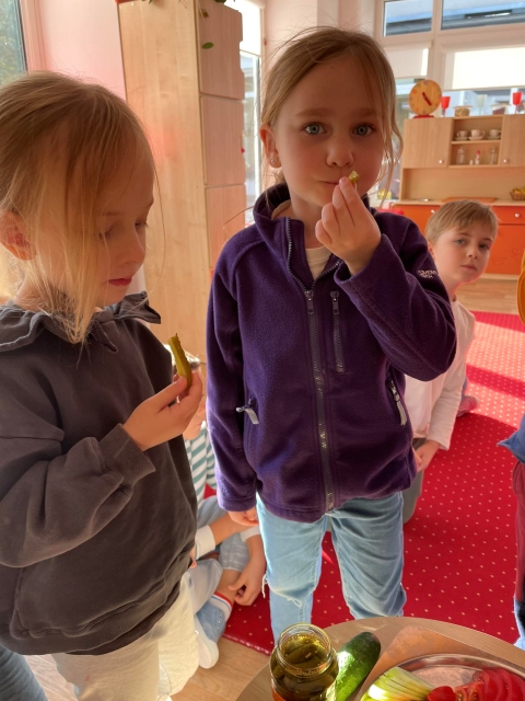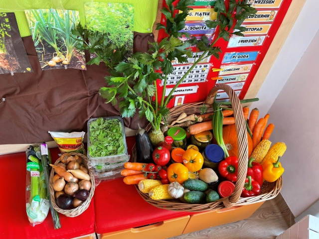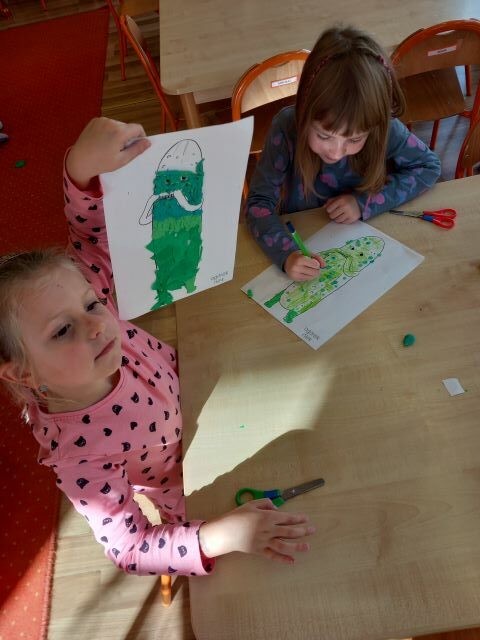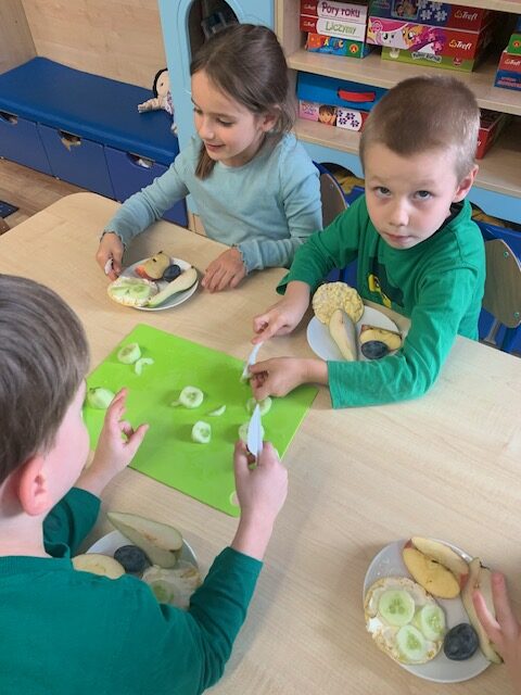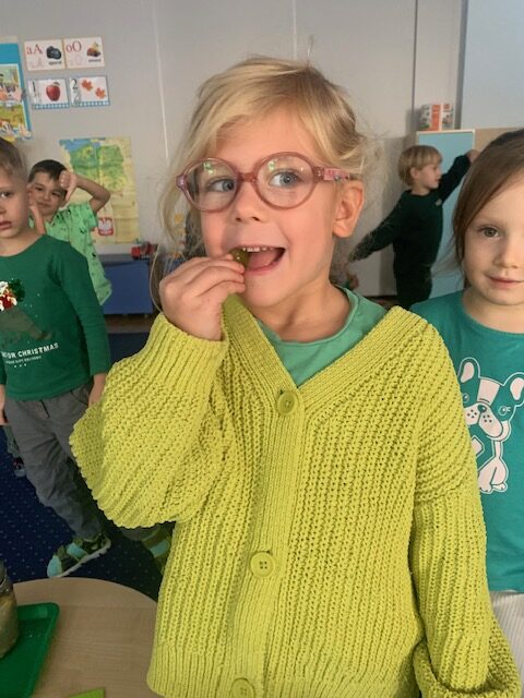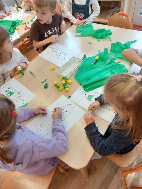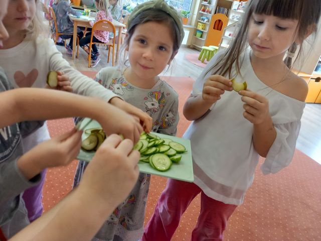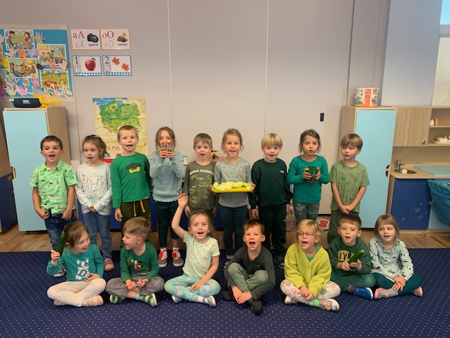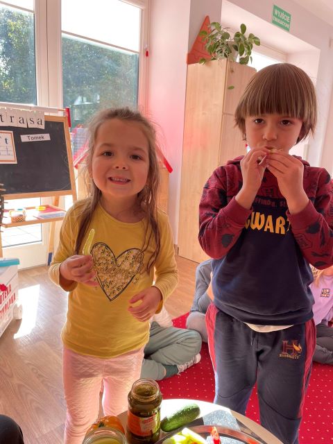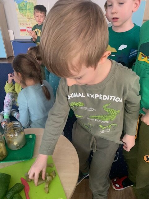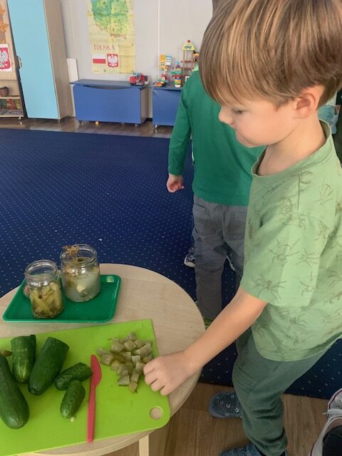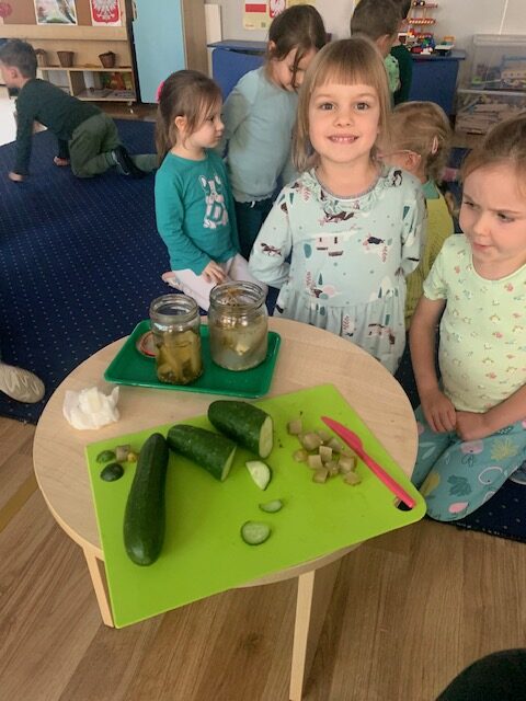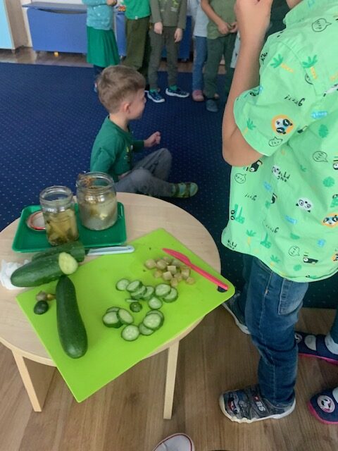 W październiku w naszym przedszkolu kolejne warzywo znalazło się w centrum uwagi. Tym razem Nasze zainteresowanie skupił „Ogórek Olek” z projektu edukacyjnego „Witaminki” wydawnictwa Bliżej Przedszkola. W czasie zajęć o tym warzywie królował ubiór w kolorze ogórkowym. Z tej okazji również, w grupach zostały przeprowadzone zajęcia, podczas których dzieci miały okazję zbadać dokładnie właściwości ogórka. Rozmawiały o jego kształcie oraz postaciach, w jakich można je przygotowywać do spożycia. Przedszkolaki wykazały się ogromną inwencją twórczą. Nie mogło oczywiście zabraknąć zabawy przy piosence: „Ogórek, ogórek, ogórek” oraz samodzielnie przygotowanych potraw z ogórkiem.