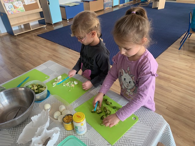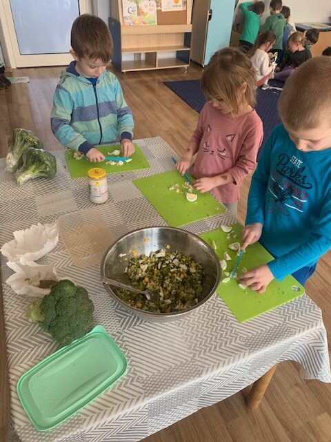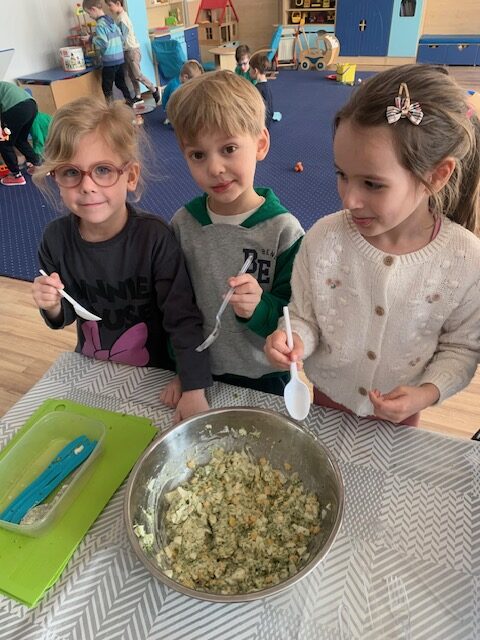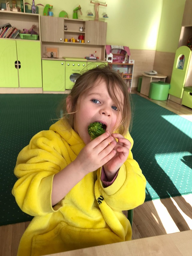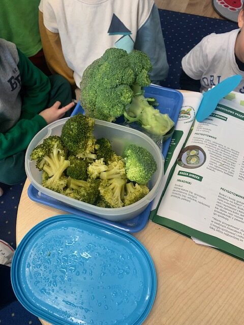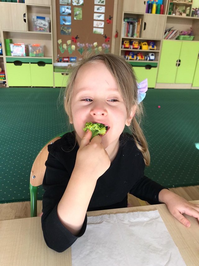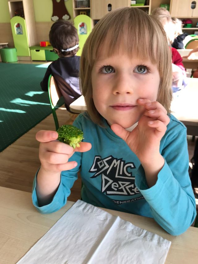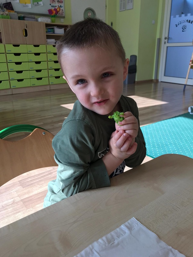 Bohaterem głównym kolejnego wyzwania w ramach projektu „Witaminki” był groszek Gucio, warzywo raczej nielubiane przez dzieci. Poznaliśmy jego wartości odżywcze, dowiedzieliśmy się jak ważny jest groszek w naszej diecie. Wymieniliśmy potrawy z groszkiem i próbowaliśmy, jak smakuje groszek. Nauczyliśmy się tez piosenki o naszym bohaterze wyzwania oraz pokolorowaliśmy naszego Gucia. Mieliśmy okazję również poznać brokuł różnymi zmysłami. Wspólnie wykonaliśmy witaminową tarczę odporności, która chroniła nas przed atakującymi wirusami w zabawie ruchowej. Wszystkie dzieci zadeklarowały, że będą starali się dbać o odporność próbując zielonych warzyw :). Na koniec wykonaliśmy wspólnie sałatkę brokułową oraz pokolorowaliśmy wizerunek naszego bohatera Borysa.
