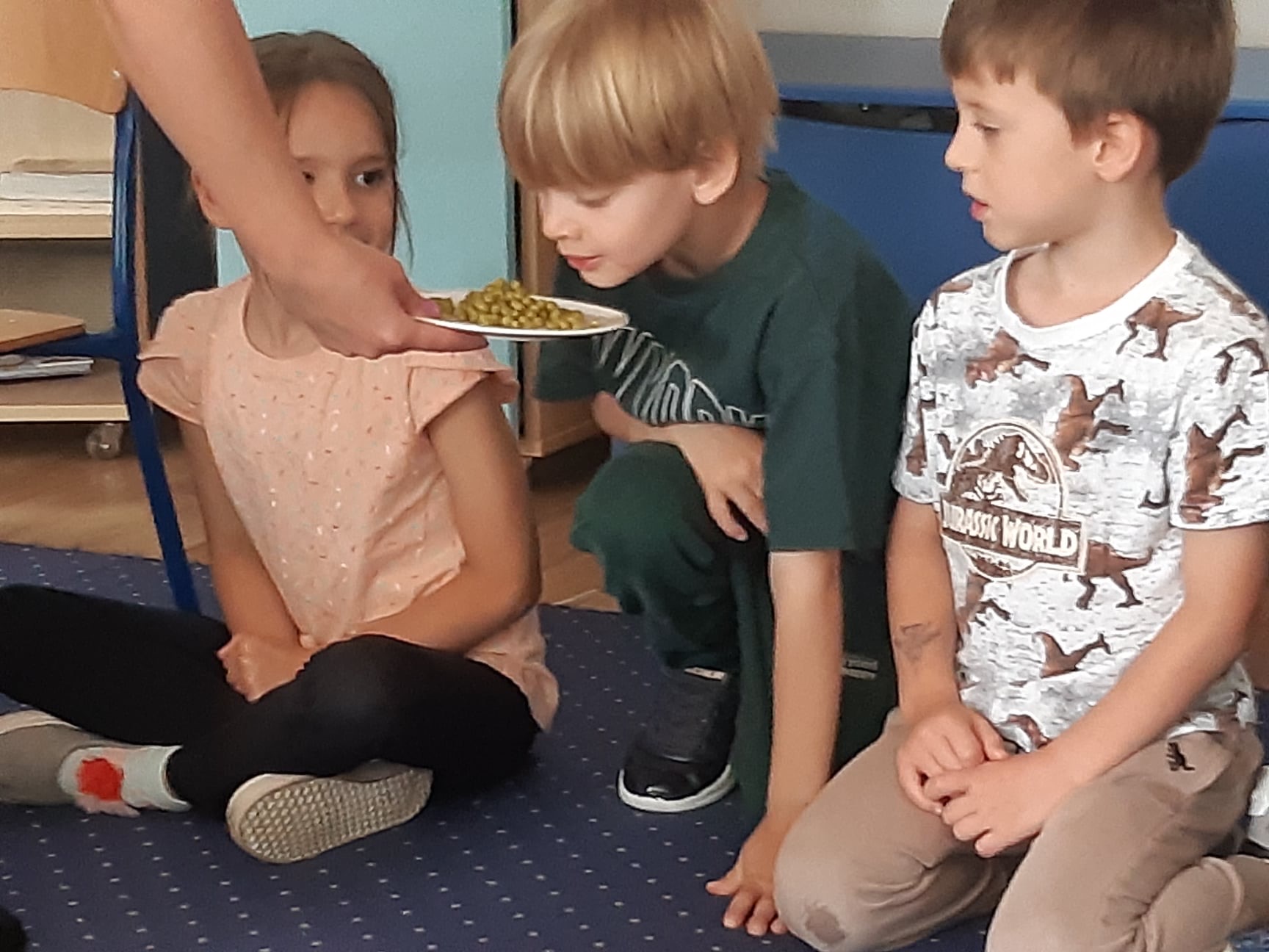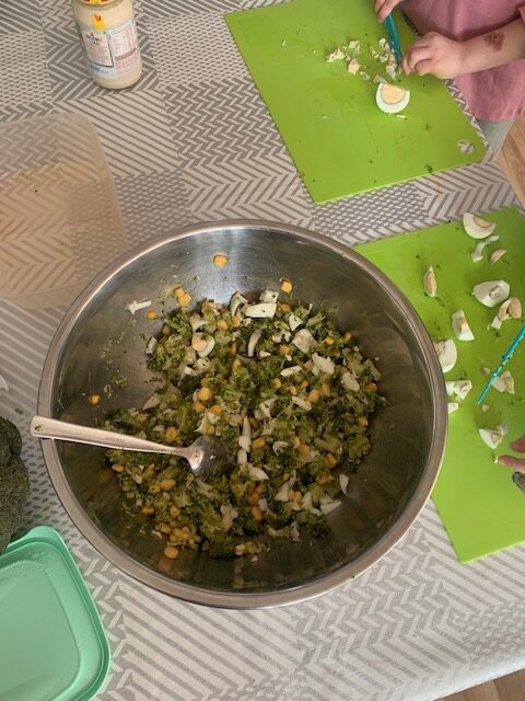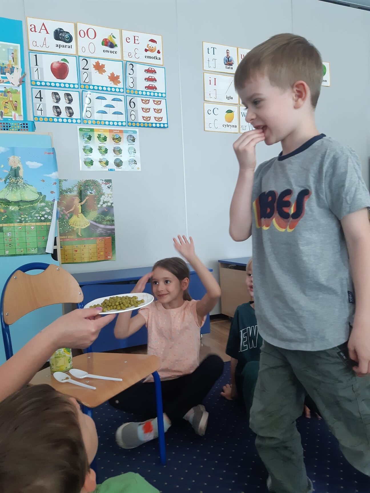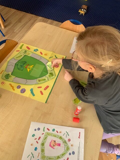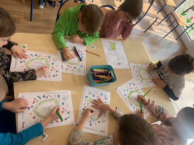 Bohaterem głównym kolejnego wyzwania w ramach projektu „Witaminki” był groszek Gucio, warzywo raczej nielubiane przez dzieci. Poznaliśmy jego wartości odżywcze, dowiedzieliśmy się jak ważny jest groszek w naszej diecie. Wymieniliśmy potrawy z groszkiem i próbowaliśmy, jak smakuje groszek. Nauczyliśmy się tez piosenki o naszym bohaterze wyzwania oraz pokolorowaliśmy naszego Gucia. Mieliśmy okazję również poznać brokuł różnymi zmysłami. Wspólnie wykonaliśmy witaminową tarczę odporności, która chroniła nas przed atakującymi wirusami w zabawie ruchowej. Wszystkie dzieci zadeklarowały, że będą starali się dbać o odporność próbując zielonych warzyw :). Na koniec wykonaliśmy wspólnie sałatkę brokułową oraz pokolorowaliśmy wizerunek naszego bohatera Borysa.