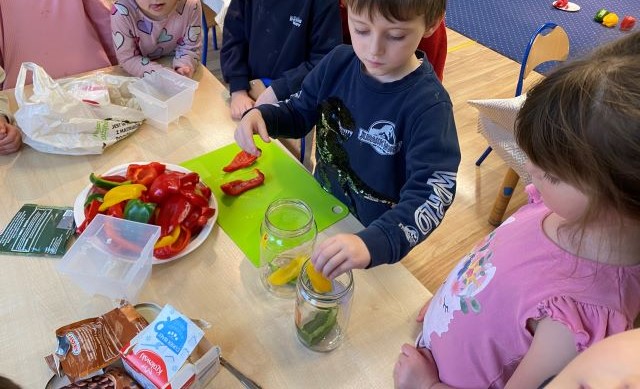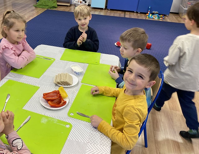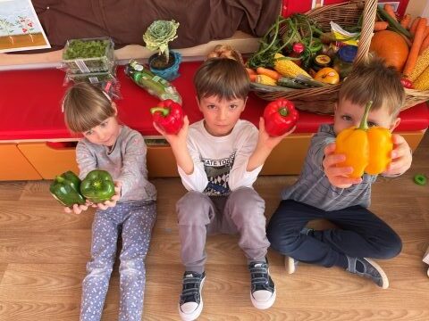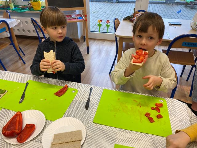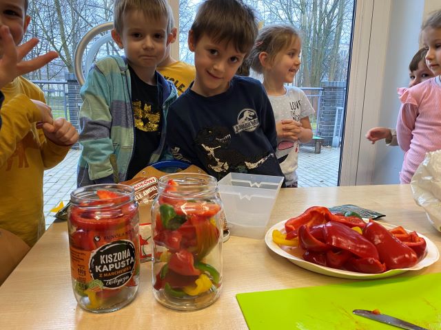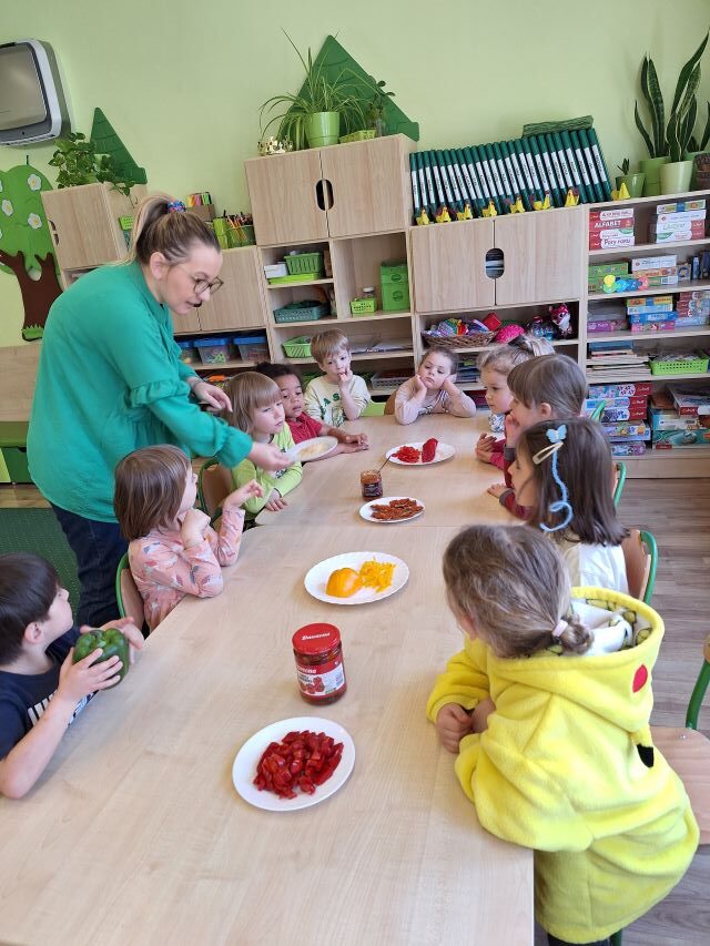 W ubiegłym czasie w Naszym przedszkolu dzieci miały okazję zaznajomić się w ramach projektu edukacyjnego WITAMINKI z papryką. Przedszkolaki dowiedziały się jakie wartości odżywcze i witaminy dostarczmy do organizmu jedząc to warzywo. Dzieci  tego dnia poznawały różne rodzaje oraz formy papryki, wąchając je i smakując. Dowiedziały się  również skąd bierze się papryka i jak rośnie. Dzieci przygotowywały z niej nie tylko kanapki ale również przetwory.