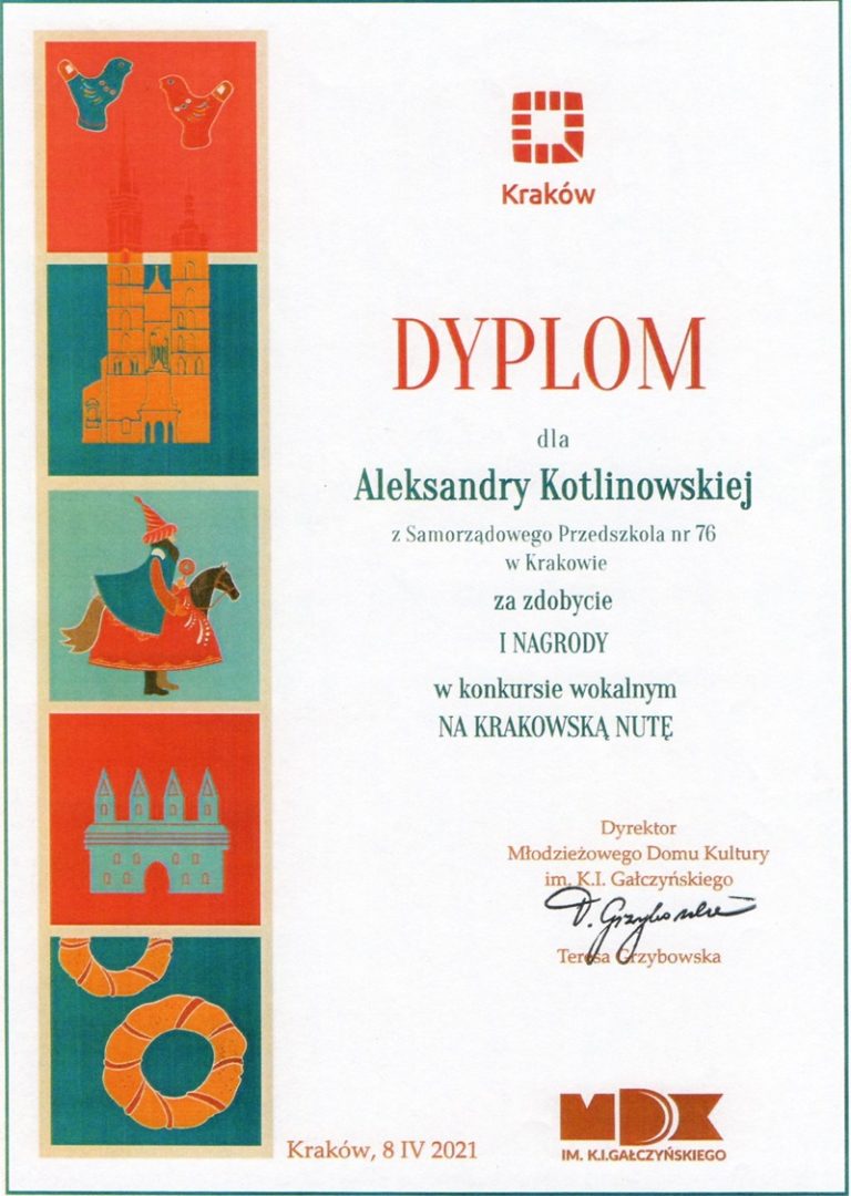 • Aleksandra Kotlinowska zajęła I miejsce w kategorii soliści – 3, 4 latki w Konkursie Wokalnym „Na krakowską nutę”, organizowanym przez Młodzieżowy Dom Kultury i. I. Gałczyńskiego w Krakowie