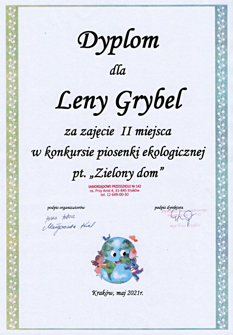 • Lena Grybel zajęła II miejsce w Konkursie Piosenki Ekologicznej „Zielony Dom”, organizowanym przez Samorządowe Przedszkole nr 142 w Krakowie