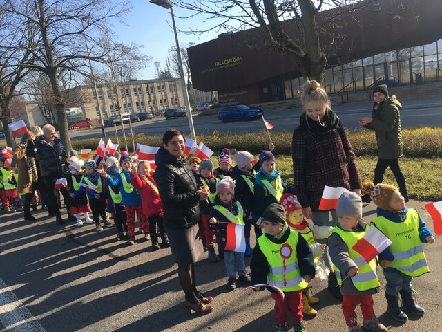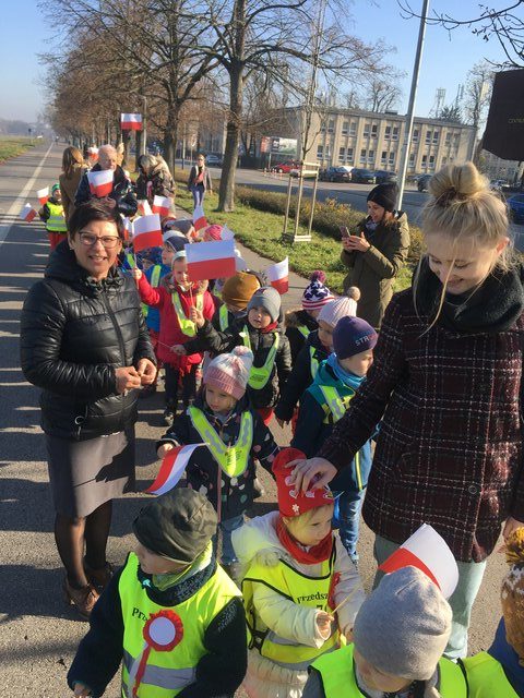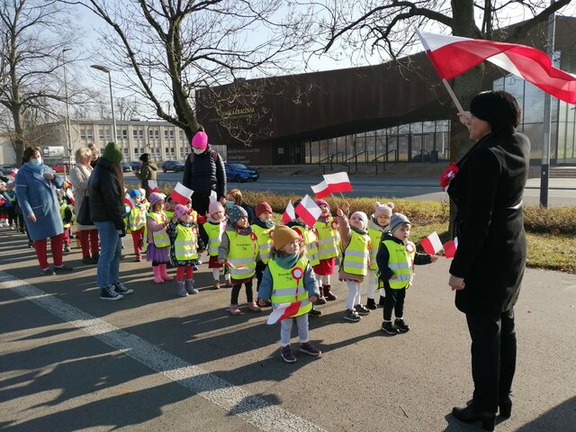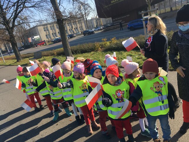 Dzieci odśpiewały ułańskie pieśni a o godzinie 11.11 stojąc na baczność odśpiewały wszystkie zwrotki hymnu państwowego. Wracały do przedszkola z flagami naszego kraju i ze słowami pięknej piosenki pt. Co to jest niepodległość?
