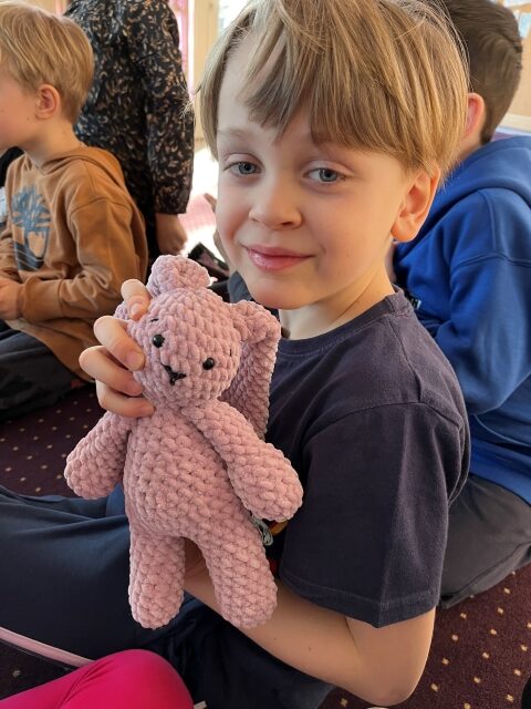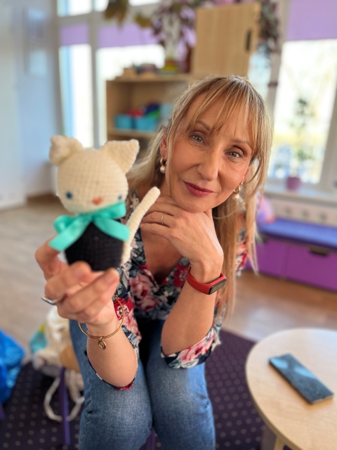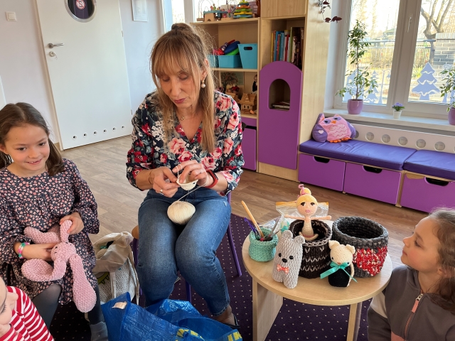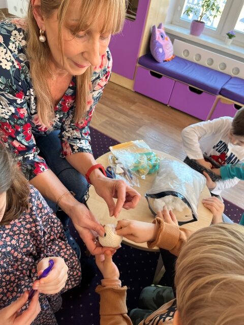 W grupie Myślicieli pojawiły się nowe zabawki. A wszystko dzięki Pani Monice, która takie cudeńka wykonuje przy pomocy włóczki i szydełka. Widzieliśmy to na własne oczy !!! Ciocia Wiktorii zaprezentowała nam kilka swoich dzieł oraz podczas zajęć pokazała nam jak z włóczki wykonuje kotki. Na koniec spotkania czekała na nas niespodzianka. Takie same zabawki, jak ten wydziergany na zajęciach kotek, zostały podarowane każdemu z nas. Radości nie było końca. My mogliśmy się odwdzięczyć dobrym słowem i laurką. A kotki otrzymały klockowe domki i razem z nami eksplorowały salę. W kolejnym dniu kotki posłużyły nam do zabaw matematycznych: ćwiczyliśmy orientację przestrzenną, sprawdzaliśmy czego jest więcej: kotków czy klockowych koszyków oraz wnioskowaliśmy czy zabawek jest tyle samo, gdy się zmieni ich ułożenie. Na koniec przeliczyliśmy ” piątkami” ilość klocków potrzebnych do zbudowania koszyczków dla każdego kotka. Bardzo dziękujemy Pani Monice i Wiktorii za wspaniałe niespodzianki.