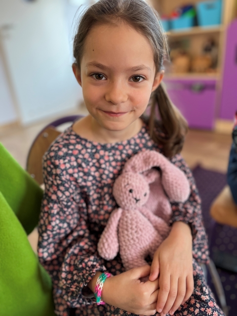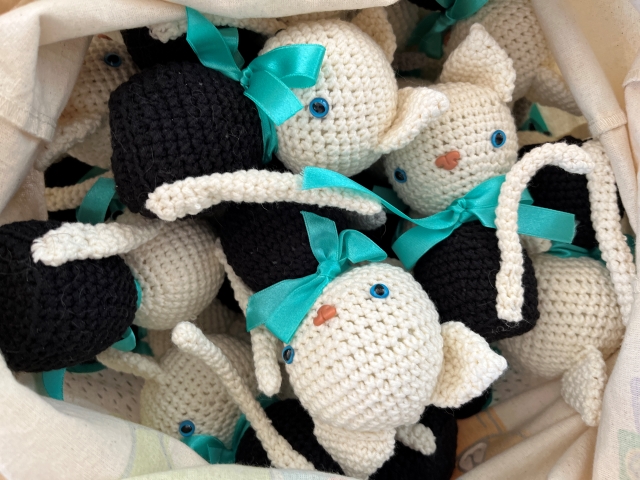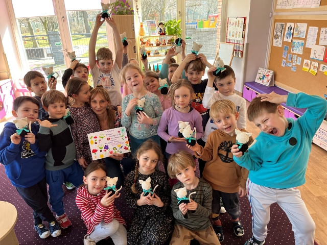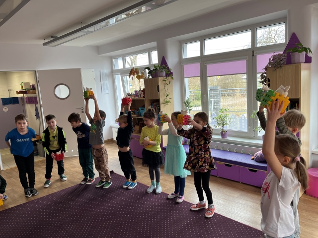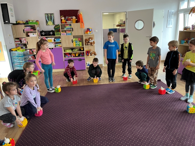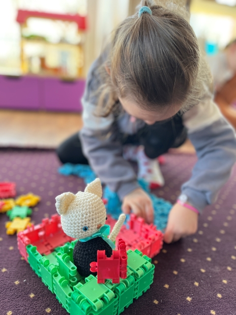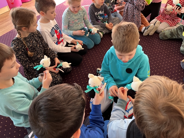 Na koniec spotkania czekała na nas niespodzianka. Takie same zabawki, jak ten wydziergany na zajęciach kotek, zostały podarowane każdemu z nas. Radości nie było końca. My mogliśmy się odwdzięczyć dobrym słowem i laurką. A kotki otrzymały klockowe domki i razem z nami eksplorowały salę. W kolejnym dniu kotki posłużyły nam do zabaw matematycznych: ćwiczyliśmy orientację przestrzenną, sprawdzaliśmy czego jest więcej: kotków czy klockowych koszyków oraz wnioskowaliśmy czy zabawek jest tyle samo, gdy się zmieni ich ułożenie. Na koniec przeliczyliśmy ” piątkami” ilość klocków potrzebnych do zbudowania koszyczków dla każdego kotka.