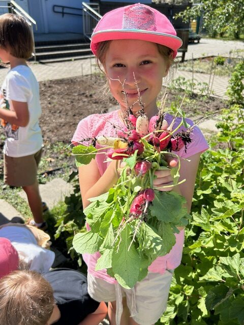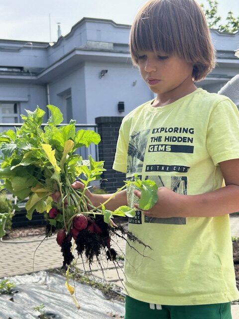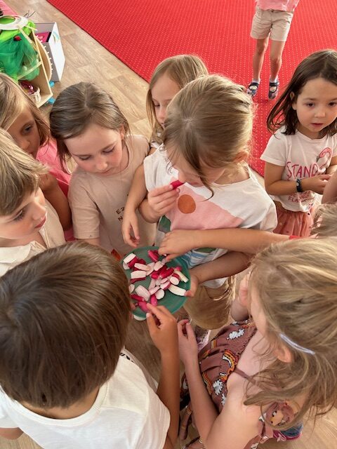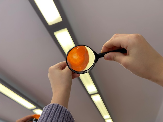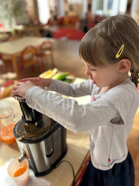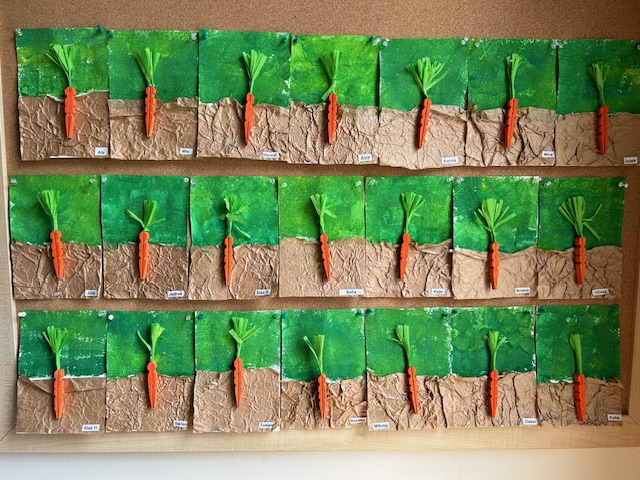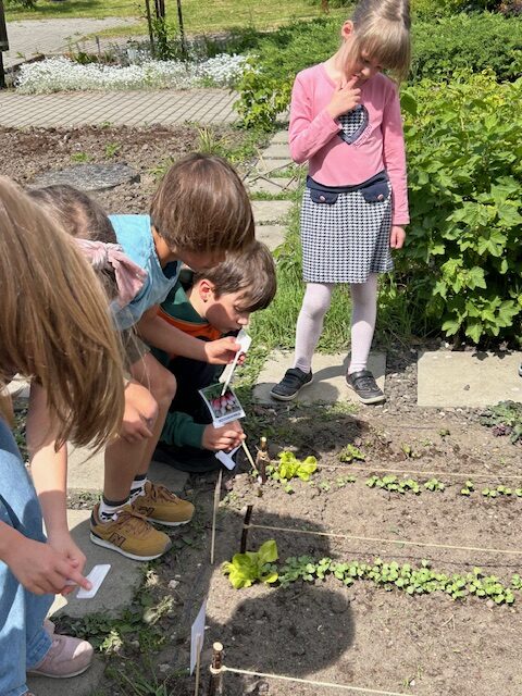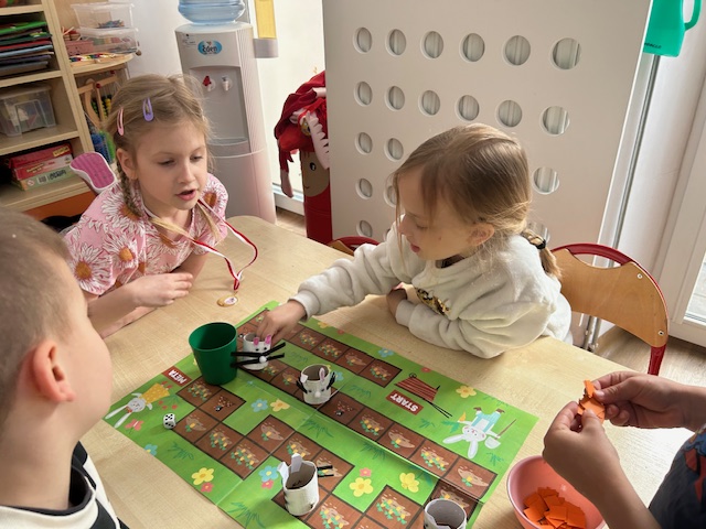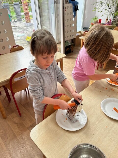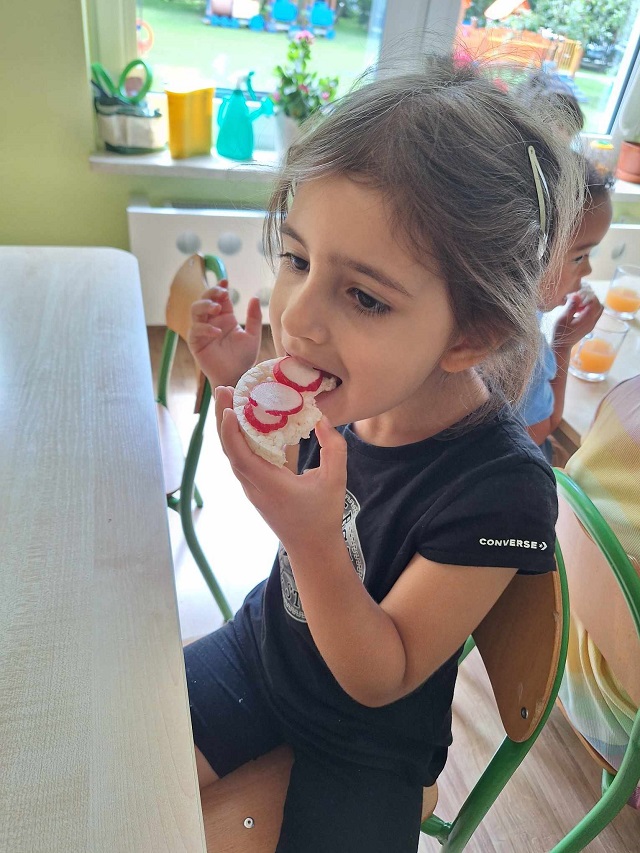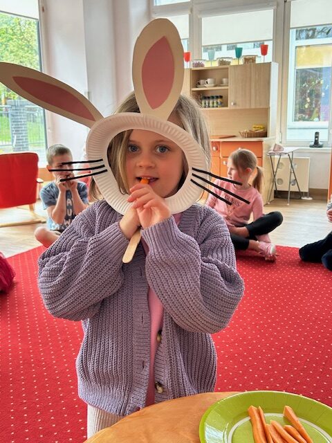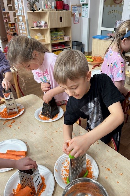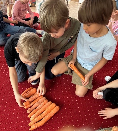 Ostatnimi dwoma warzywami, na temat których przedszkolaki zgłębiały wiedzę były to rzodkiewka oraz marchew. Pierwszy z nich dzieci miały okazję poznać już od samego wysiewu nasion poprzez obserwację wzrostu aż po zbiór i degustację. Przedszkolaki chętnie eksperymentowały również z marchewką. Dzieci porównywały długość, grubość i kolor korzeni marchwi a także układały szeregi od najkrótszej do najdłuższej, od najchudszej do najgrubszej marchewki. Oglądaliśmy pojedyncze nasiona i te na taśmie korzystając z lup. „Zajączki” chrupały surowe marchewki, a „dzieci” gotowane, w formie chipsów i marchewkowego spaghetti. Przygotowaliśmy sok z marchwi, a ponieważ lubimy eksperymentować, to dodaliśmy do niego sok z jabłek, selera. Podczas zabaw kulinarnych uczyliśmy się trzeć surowe warzywa na tarkach .Przygotowaliśmy 2 surówki: z marchwi i jabłek oraz marchwi i selera. W zespołach graliśmy w grę planszową „Polowanie na marchewki”, pionkami były zajączki samodzielnie przygotowane wcześniej. Cykl zabaw z „Marchewką Mają” zakończyliśmy wykonaniem marchewki z drewnianej klamerki do bielizny i bibuły.