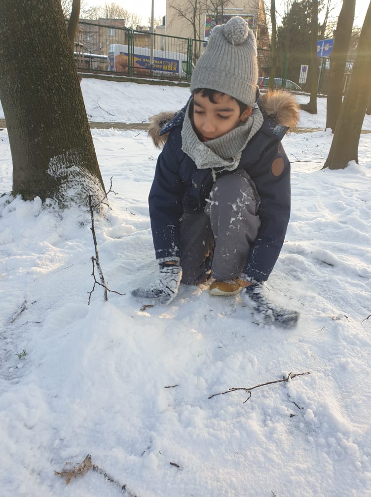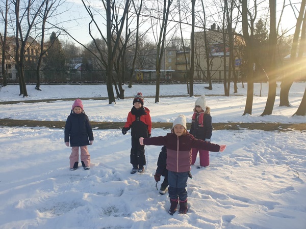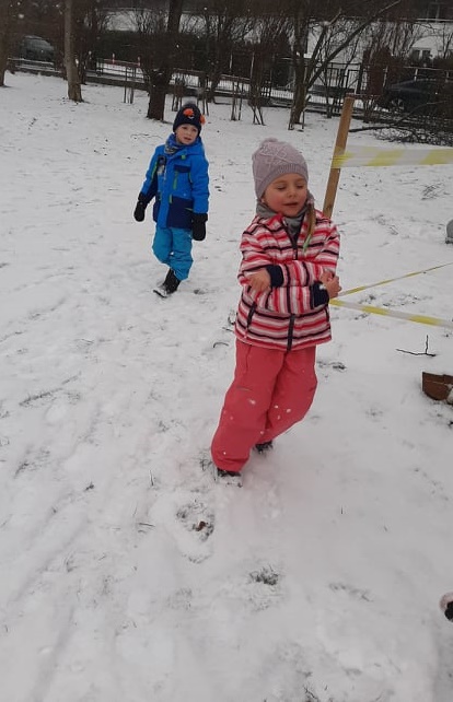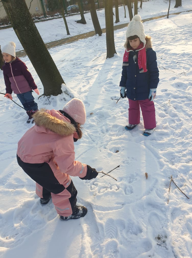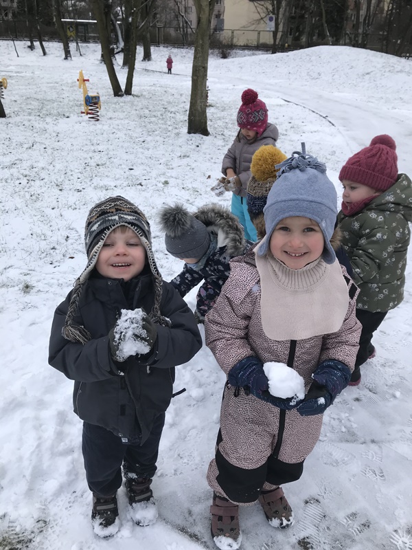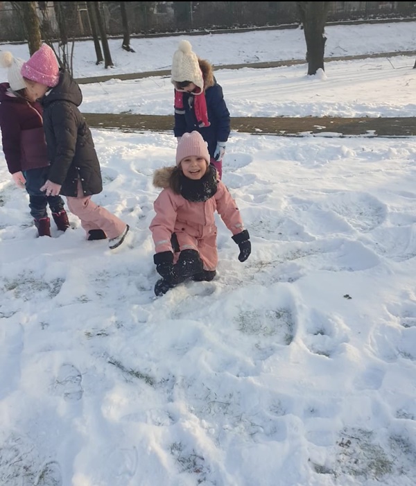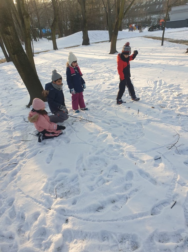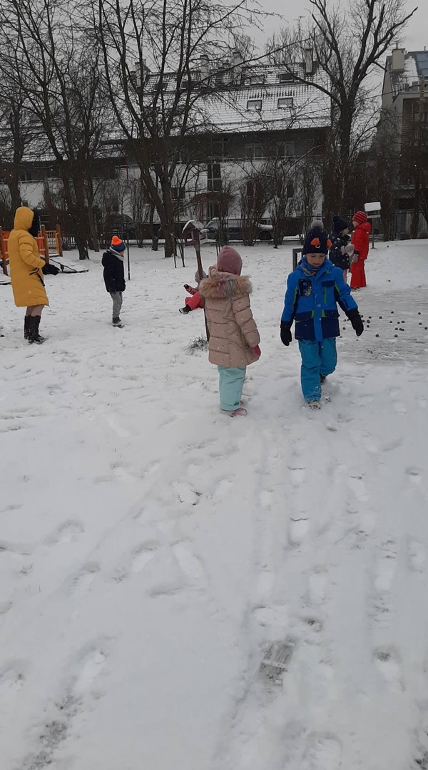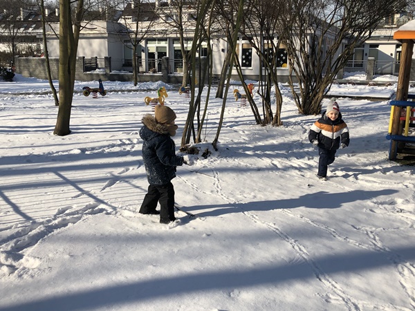W tym roku zima ma różne humory; raz jest łagodna i ciepła a czasem mroźniejsza i sypnie śniegiem. W takie białe i śnieżne dni z radością wychodzimy do ogrodu. Można wtedy pozjeżdżać z górki, ulepić bałwana, odcisnąć ” aniołka” i urządzać „bitwę na śnieżki”. Pamiętamy by było bezpiecznie, więc celujemy w nogi lub buty. W czasie spacerów sprawdzaliśmy też co słychać na grządkach i dbamy o ptaki.