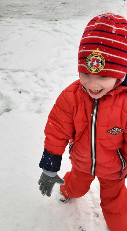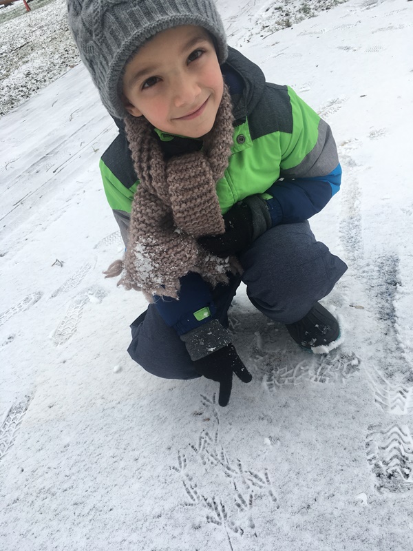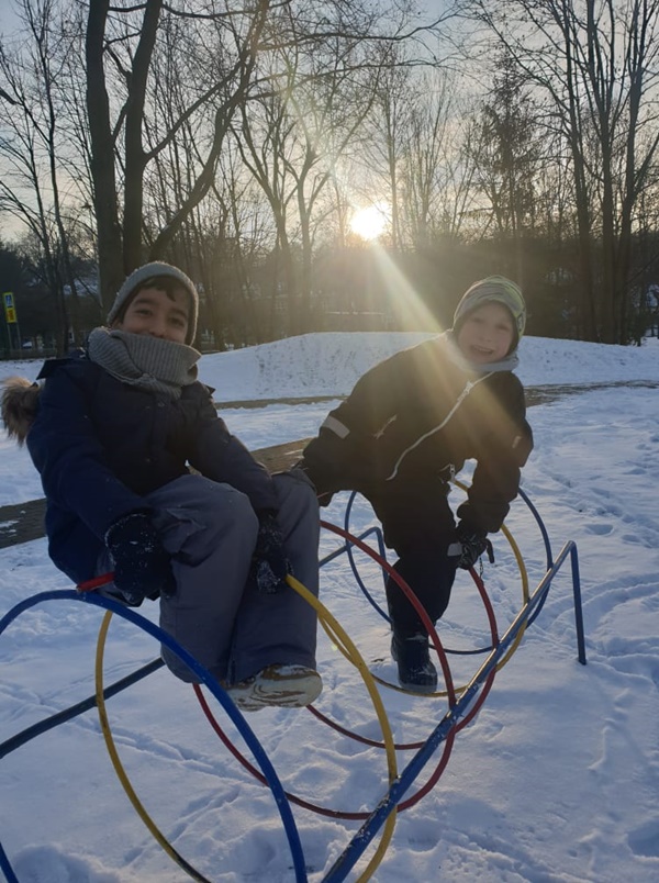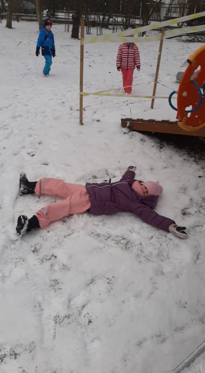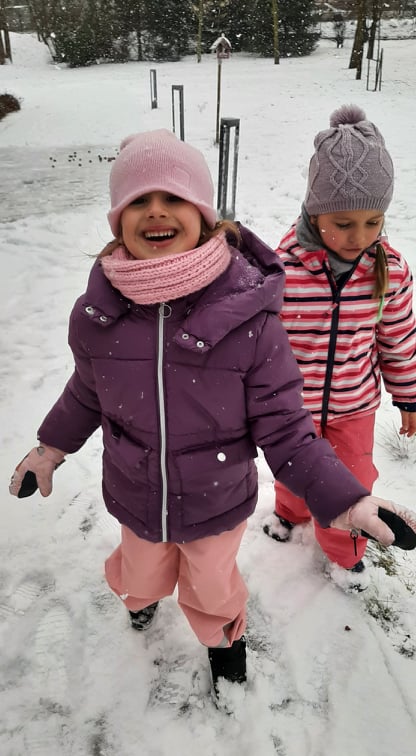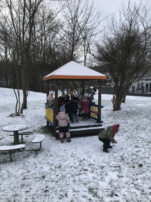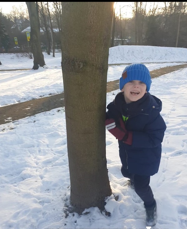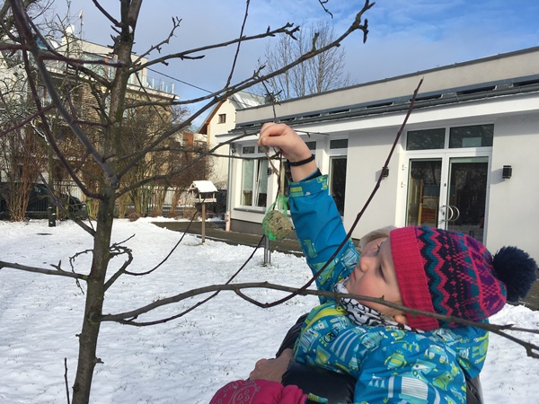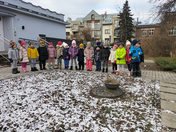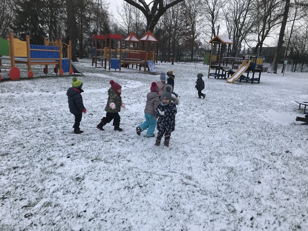 W tym roku zima ma różne humory; raz jest łagodna i ciepła a czasem mroźniejsza i sypnie śniegiem. W takie białe i śnieżne dni z radością wychodzimy do ogrodu. Można wtedy pozjeżdżać z górki, ulepić bałwana, odcisnąć ” aniołka” i urządzać „bitwę na śnieżki”. Pamiętamy by było bezpiecznie, więc celujemy w nogi lub buty. W czasie spacerów sprawdzaliśmy też co słychać na grządkach i dbamy o ptaki.