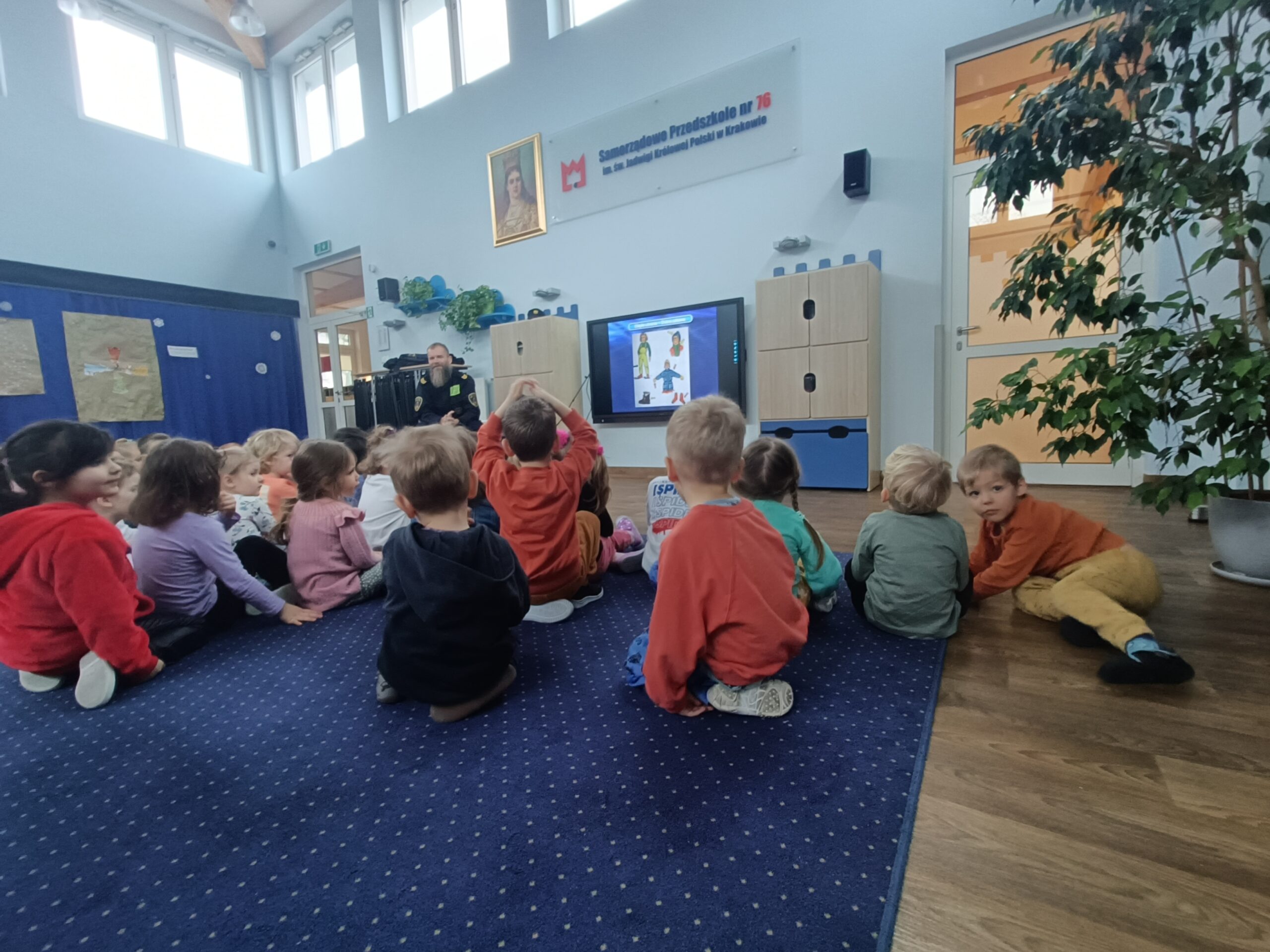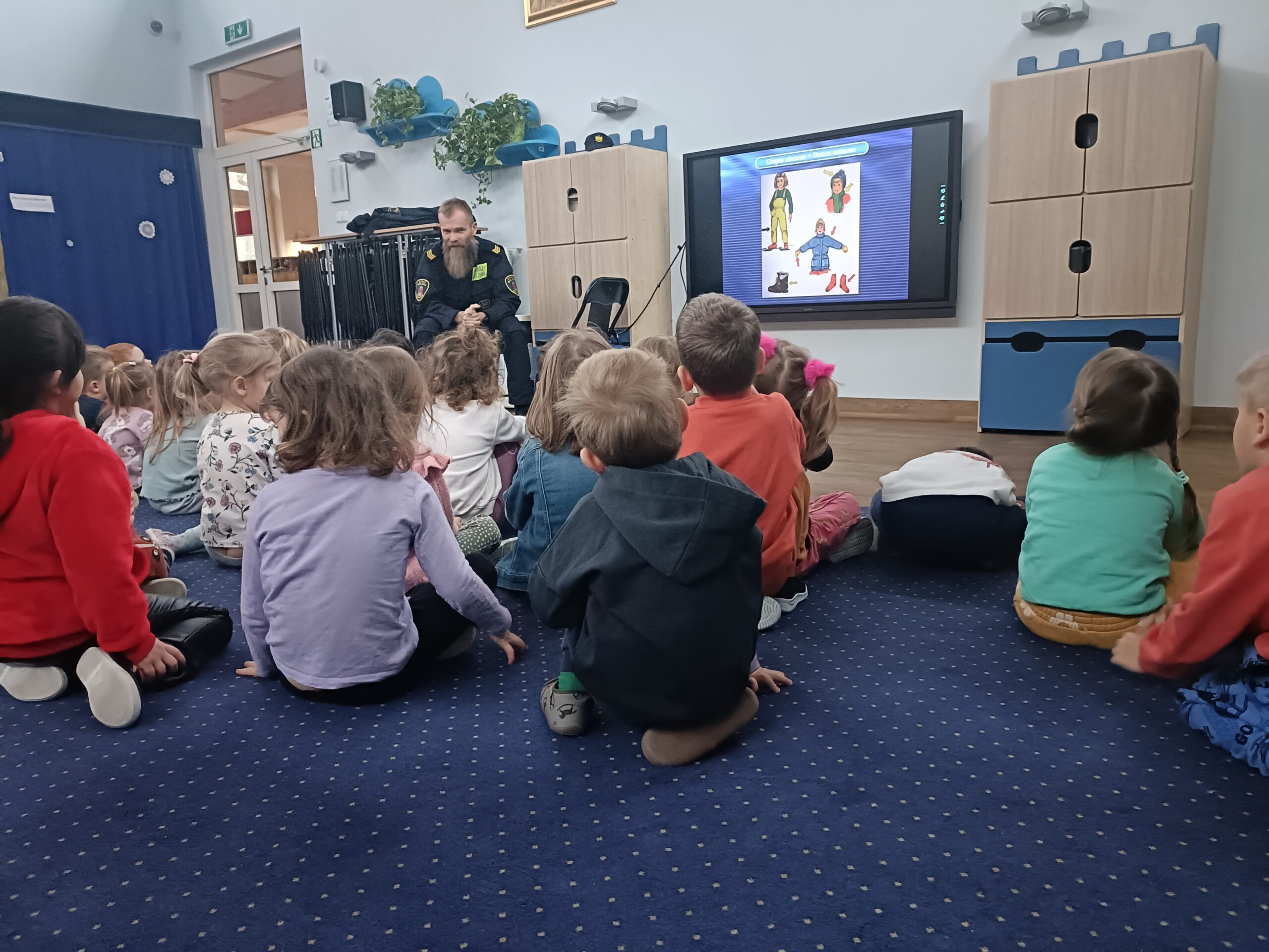 07. 02. 2025 r. nasze przedszkole odwiedzili Strażnicy Miejscy. Dzieci poznały bezpieczne zabawy na śniegu i lodzie a następnie obejrzały film animowany o przygodach niebieskiego smoka.