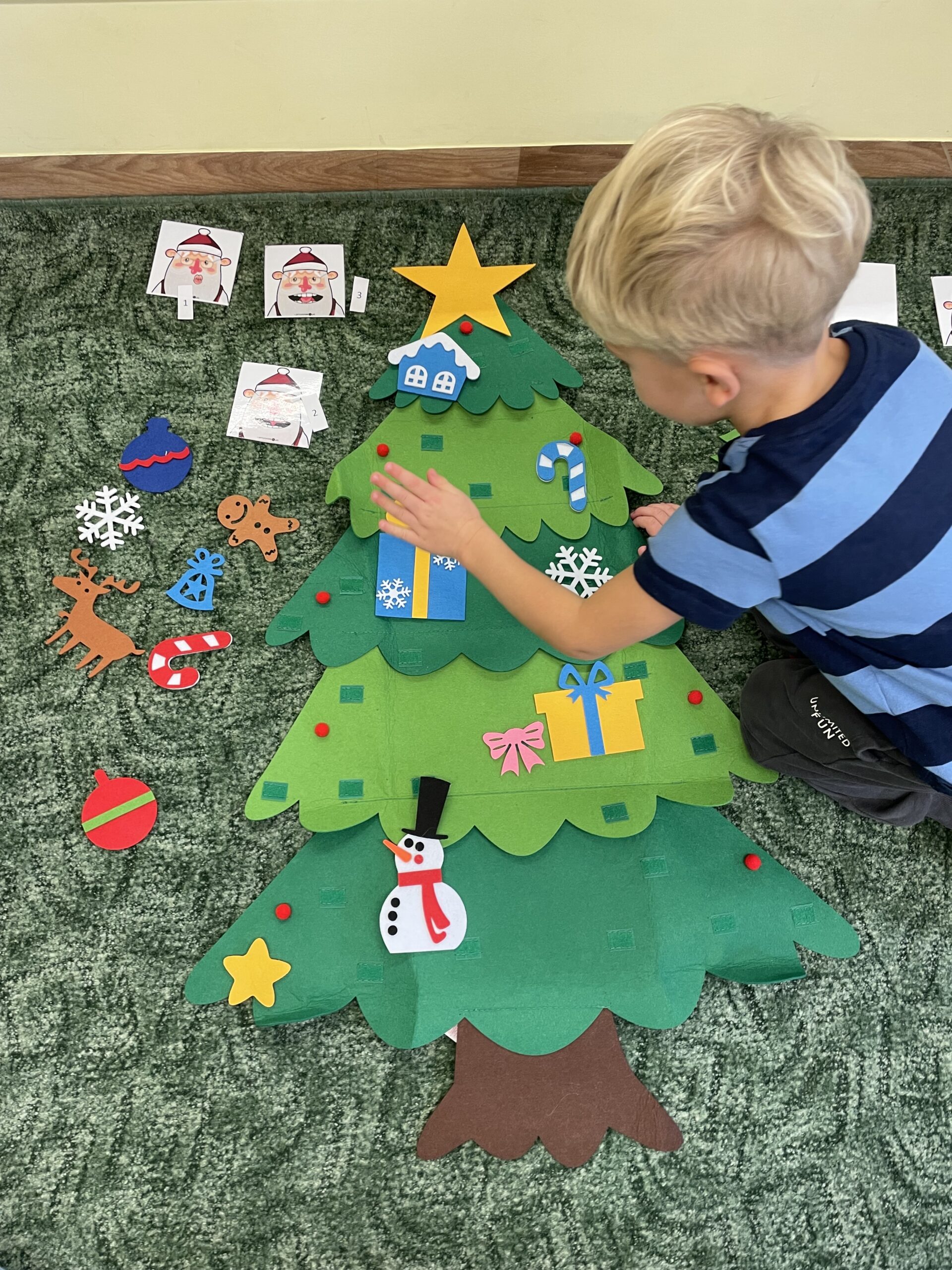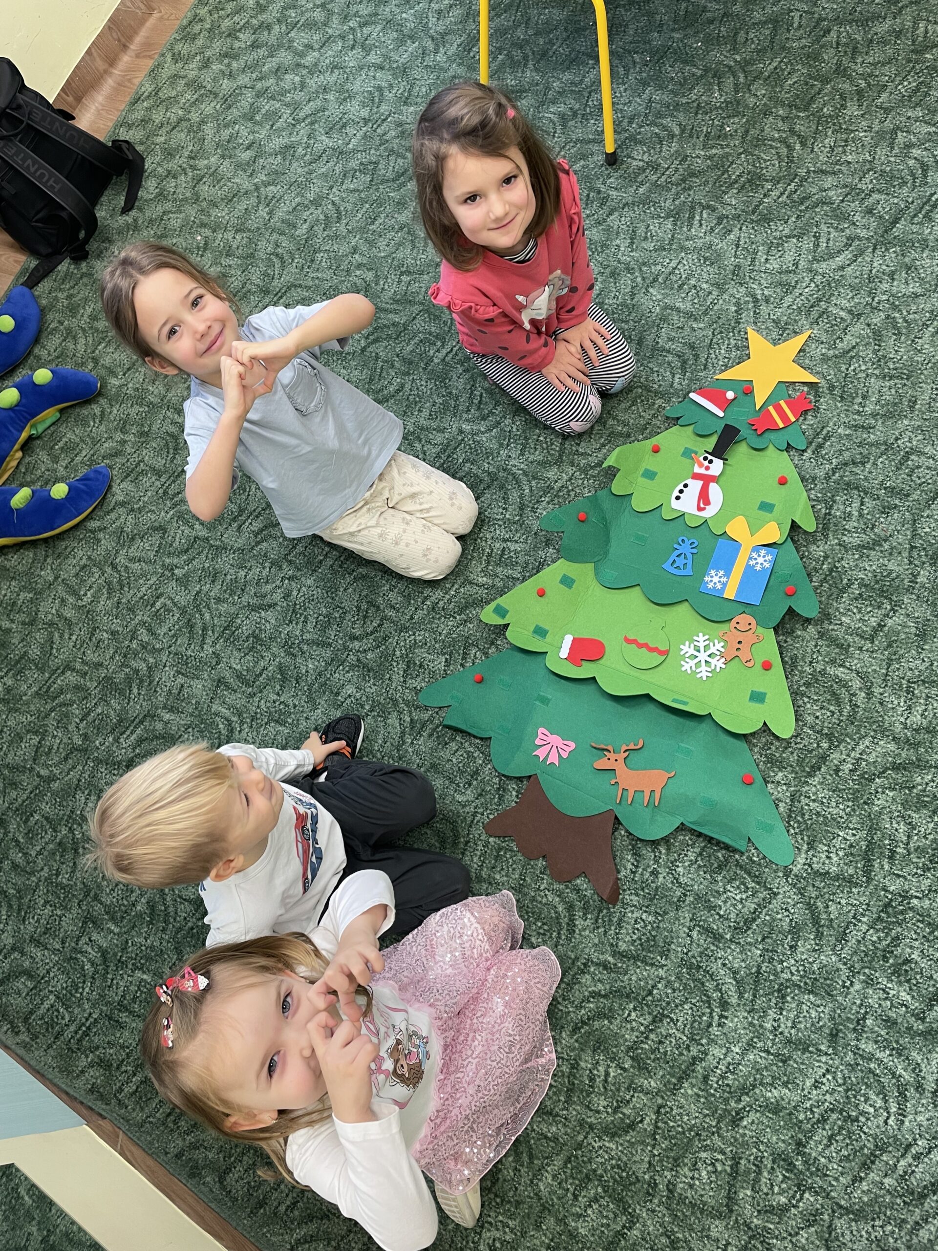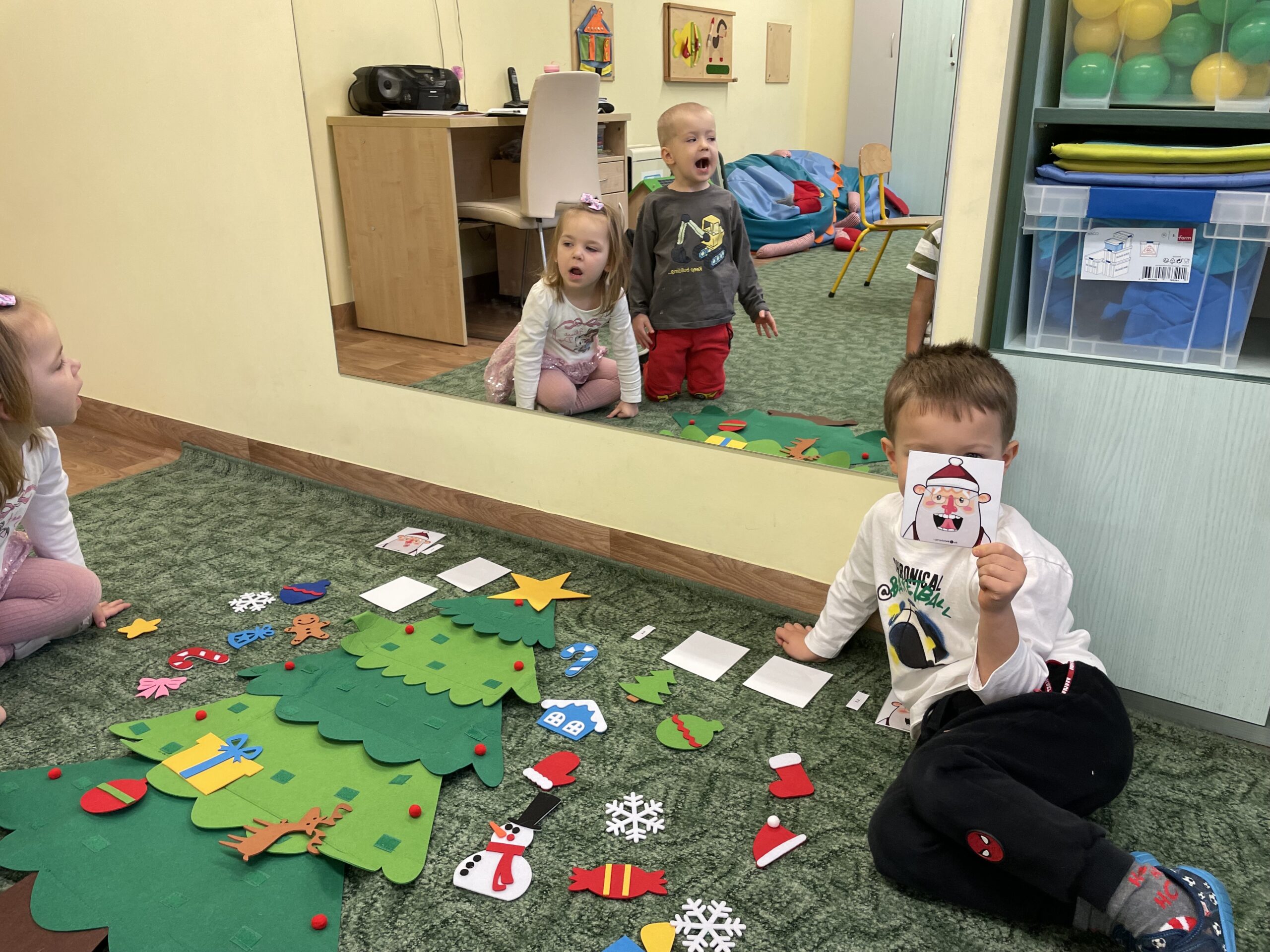 W okresie przedświątecznym również w sali logopedycznej atmosfera zamieniła się w świąteczną. 9 i 16 grudnia na zajęciach zagościła choinka, a ćwiczenia logopedyczne wykonywał z nami święty Mikołaj! Dzieci losowały obrazki przedstawiające Mikołaja wykonującego ćwiczenia buzi i języka, a pod obrazkami skrywały się cyferki. Po wykonaniu ćwiczenia logopedycznego, dzieci zawieszały na choince liczbę ozdób zgodną z wylosowaną cyferką… To nie tylko świetna okazja do poznawania obrazu graficznego cyfr, nauki liczenia, ale przede wszystkim ćwiczeń artykulacyjnych – słowa “snieżynka”, “czapka”, “rękawiczka”, “pierniczek”, “dzwoneczek”, “laska cukrowa”… świetnie rozgrzały języki przed dalszymi ćwiczeniami, rozwijając przy okazji zasób słownictwa i motorykę narządów aparatu artykulacyjnego.