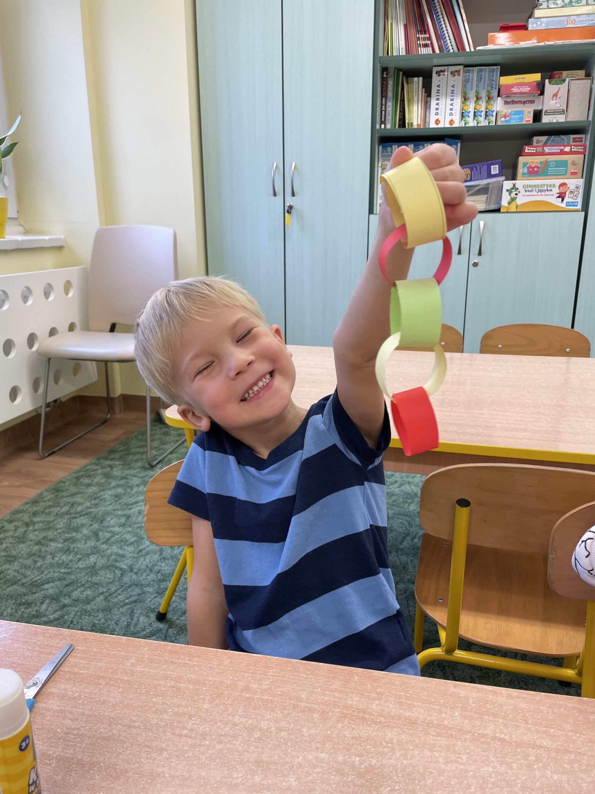 Dodatkowo dzieci miały możliwość wykonania łańcucha choinkowego z papieru. Oprócz utrwalenia nazw kolorów, uczyliśmy się kontynuowania sekwencji trzyelementowej, a także doskonaliliśmy umiejętność wycinania papieru nożyczkami. A zabawy było przy tym co niemiara !