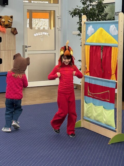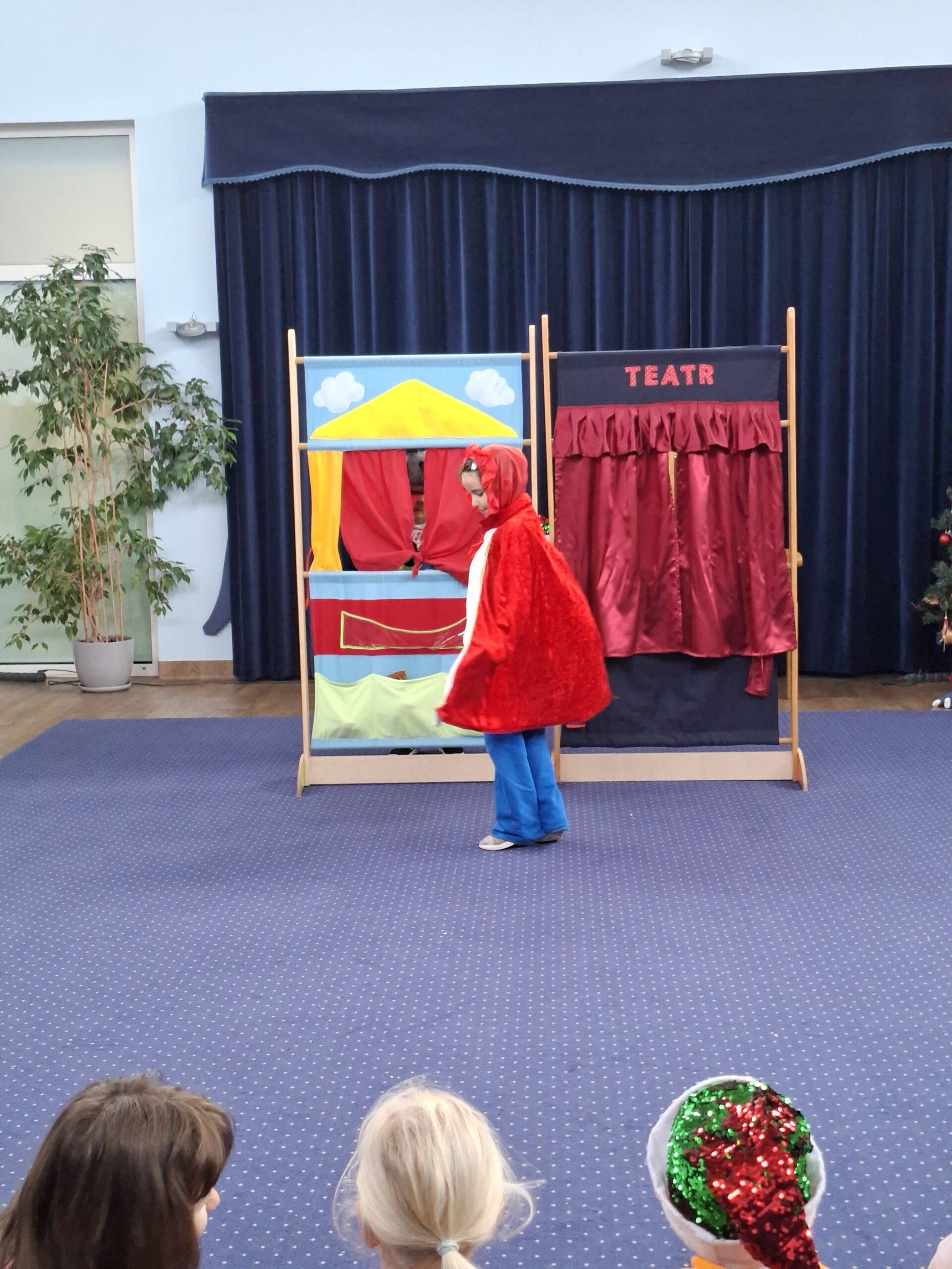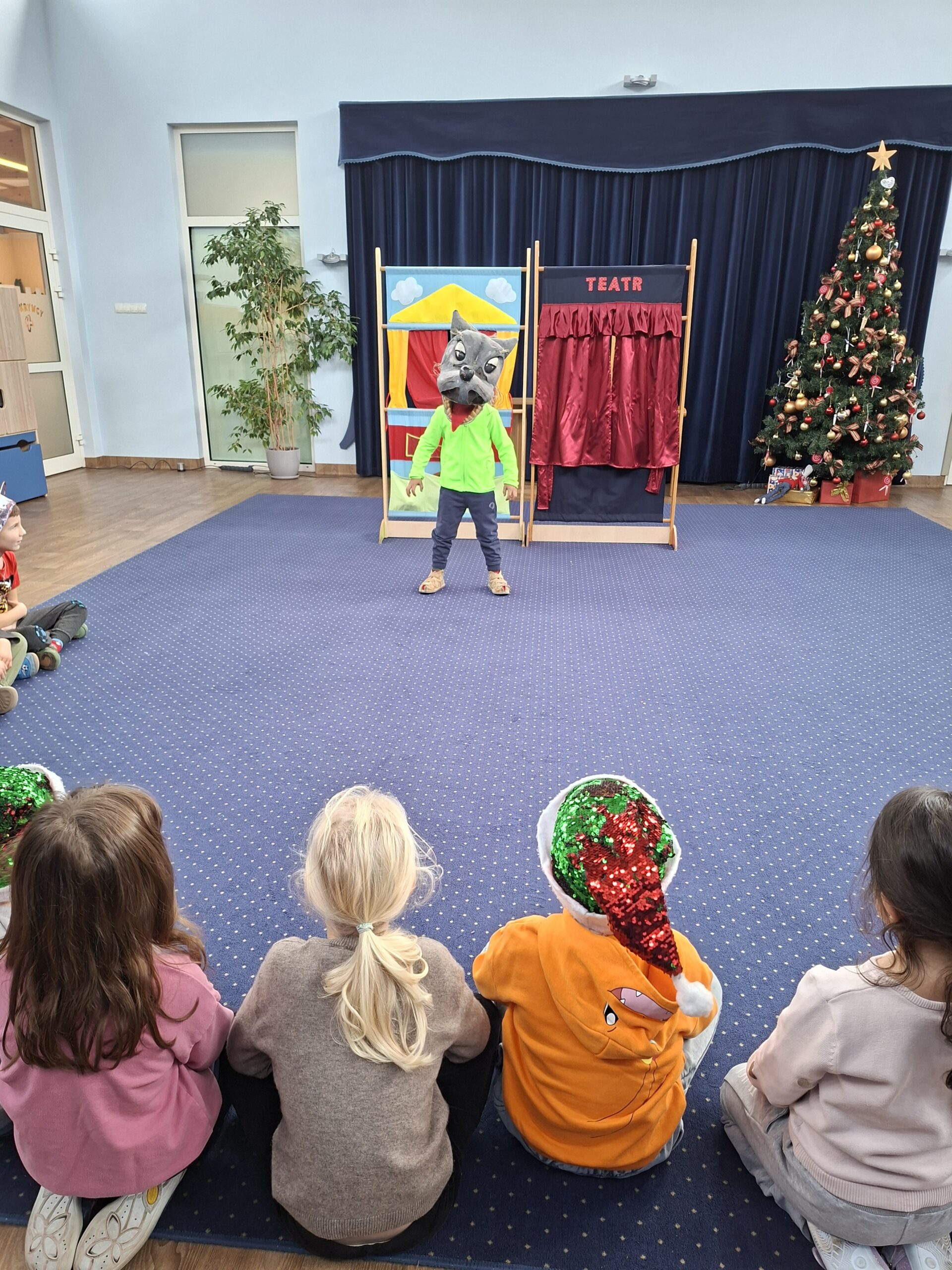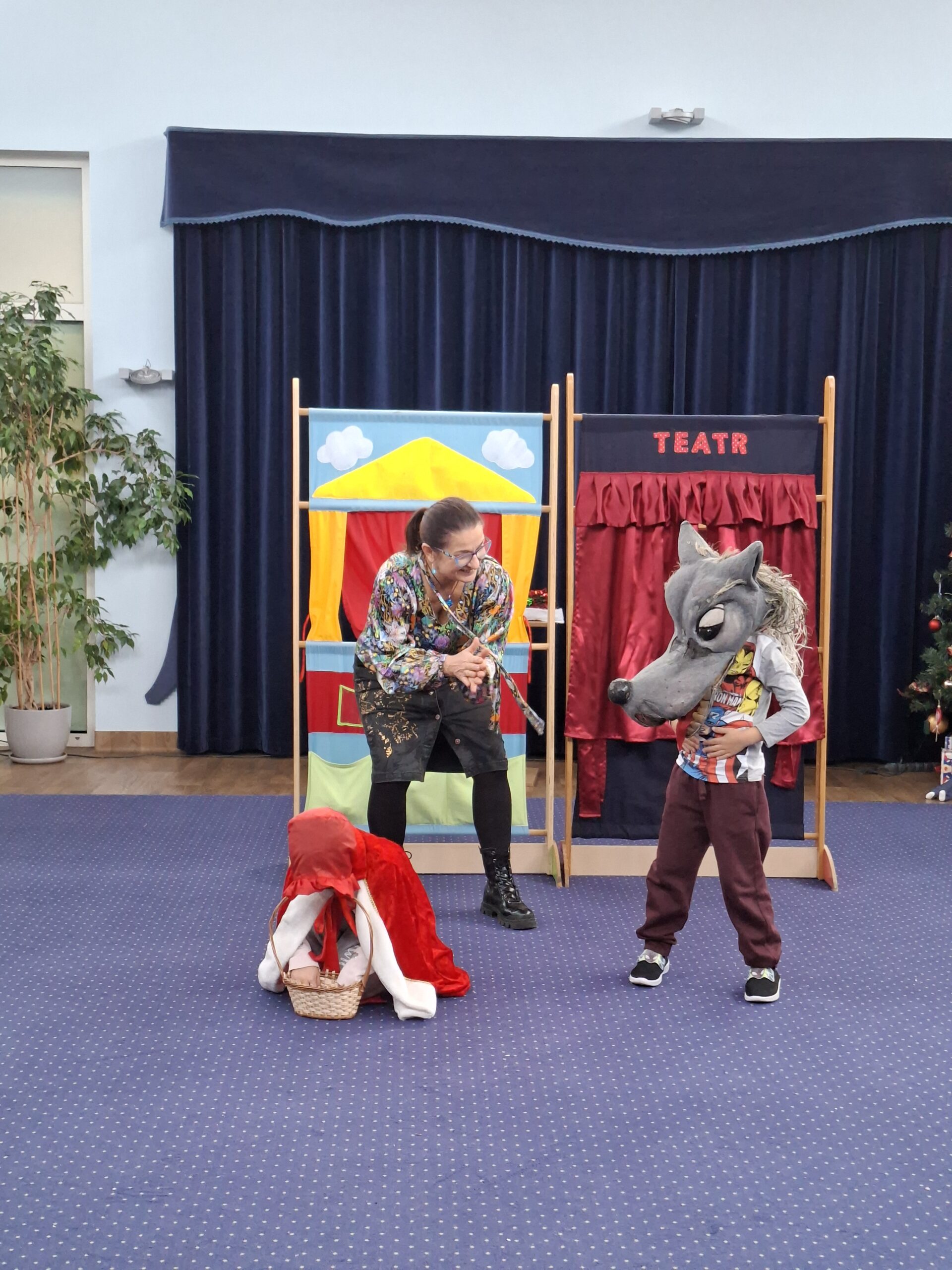 W dniu 04.12.2025 w naszym przedszkolu po raz kolejny odbyły się warsztaty teatralne prowadzone przez byłą aktorkę teatru Groteska oraz cenioną pedagog z wieloletnim doświadczeniem w pracy z dziećmi – panią Małgorzatę Karpowicz-Dukat. Podczas warsztatów dzieci odgrywały scenki z bajki “Czerwony Kapturek”. Dzieci miały możliwość wejścia do tajemniczego świata baśni, dzięki użyciu różnego rodzaju rekwizytów, strojów i masek teatralnych. Odgrywanie konkretnych scenek było dla małych aktorów świetną okazją do otworzenia się przed innymi, przeżywania różnych emocji i oswajania się ze sceną.