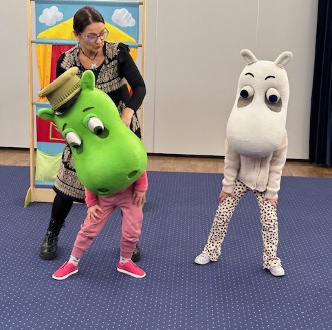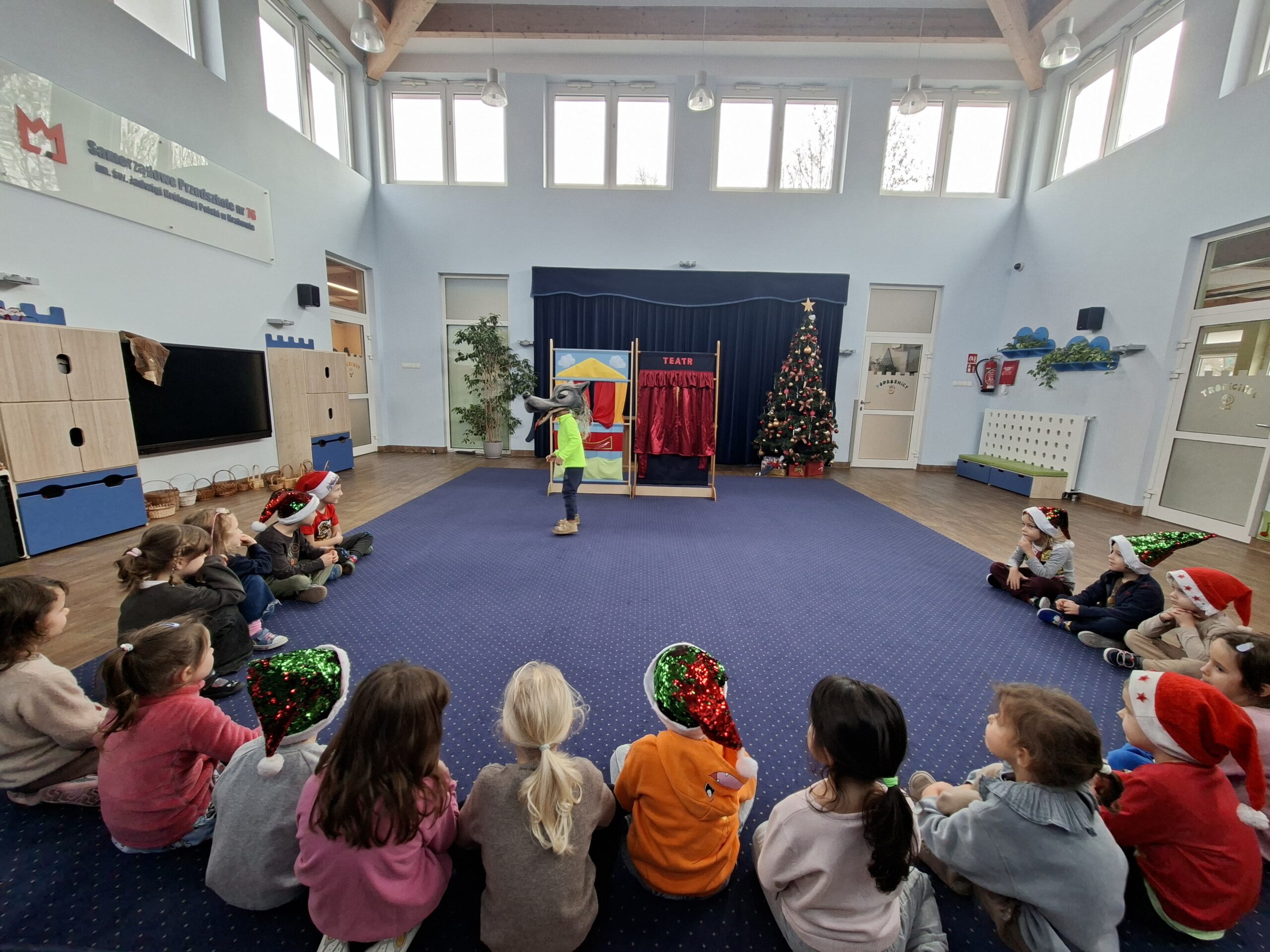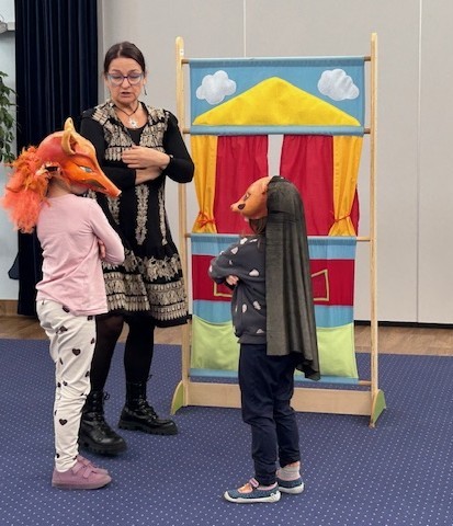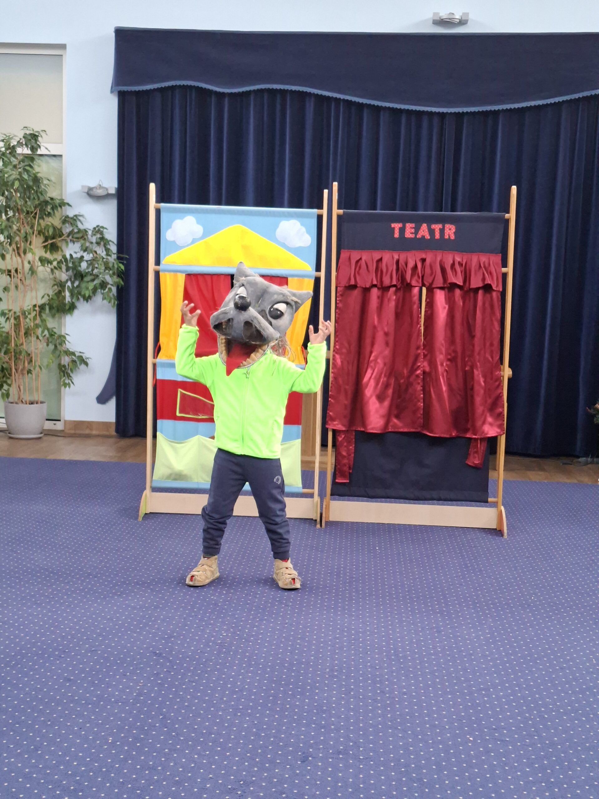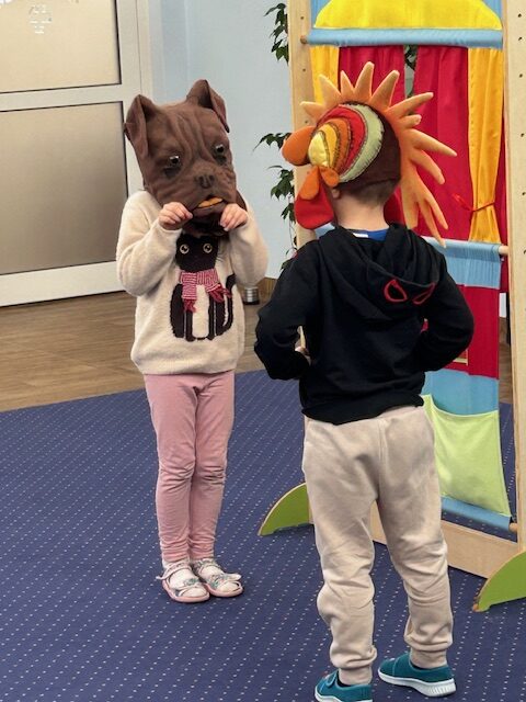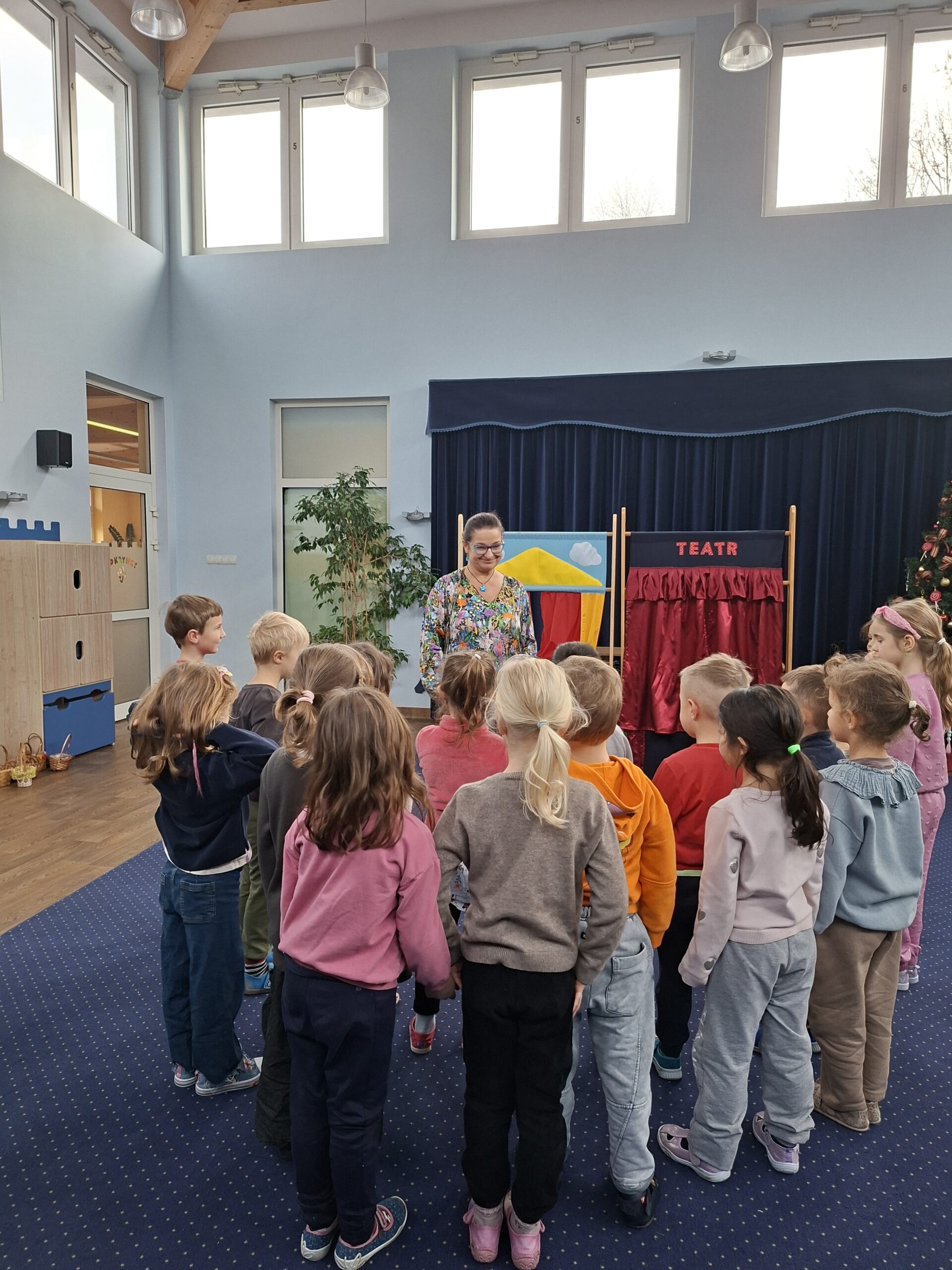 W dniu 04.12.2025 w naszym przedszkolu po raz kolejny odbyły się warsztaty teatralne prowadzone przez byłą aktorkę teatru Groteska oraz cenioną pedagog z wieloletnim doświadczeniem w pracy z dziećmi – panią Małgorzatę Karpowicz-Dukat. Podczas warsztatów dzieci odgrywały scenki z bajki “Czerwony Kapturek”. Dzieci miały możliwość wejścia do tajemniczego świata baśni, dzięki użyciu różnego rodzaju rekwizytów, strojów i masek teatralnych. Odgrywanie konkretnych scenek było dla małych aktorów świetną okazją do otworzenia się przed innymi, przeżywania różnych emocji i oswajania się ze sceną.